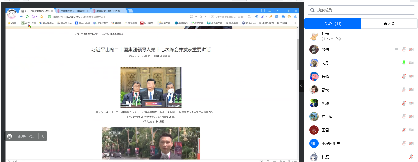 学习分为集中学习和会后自学两部分,会上集中学习了近平总书记在出席二十国集团领导人第十七次峰会上的重要讲话精神、习近平总书记给中国航空工业集团沈飞“罗阳青年突击队”队员们的回信、陈敏尔在学习贯彻党的二十大精神中央宣讲团报告会上的宣讲报告、习近平谈治国理政(第4卷)第五篇章——统筹疫情防控和经济社会发展等内容。