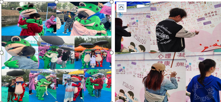 活动现场,学生志愿者们穿上玩偶服装扮演成蛙蛙,可爱的造型一亮相便成了师生关注的焦点,吸引了不少大大小小的“粉丝”,同学们不惧大雨,井然有序排起长队与蛙蛙拥抱合影。活动还精心准备了心愿墙,同学们纷纷在心愿墙上写下自己对好友、家人、学校的感谢以及对未来的期许,通过心愿便利贴的方式引导同学们学会善待自我,关爱他人,接纳并拥抱真实的自己,用心去感受生活的美好。