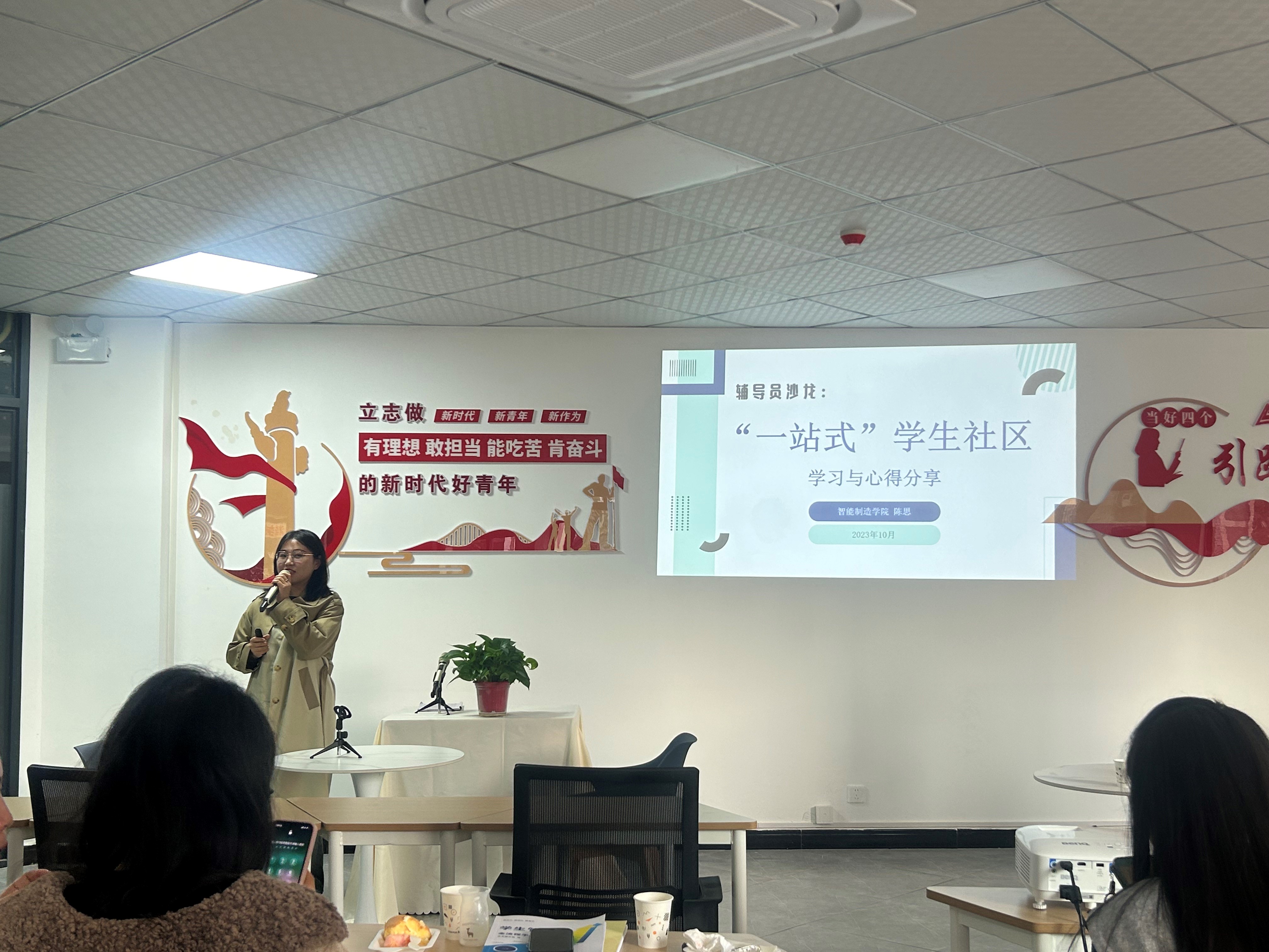 在育人队伍刚入驻“一站式”学生社区,各书院紧紧围绕建设目标,搭建育人载体,实施双院协同育人的契机下,此次活动紧密围绕“一站式”学生社区,分为自主阅读、读书分享、案例研讨、小组讨论四个环节开展。读书分享环节中,智能制造学院陈思老师围绕“辅导员如何建设“一站式”学生社区”这一话题与辅导员们现场进行了读书分享,她从三个方面提出了自己的意见:在社区组织保障上,落实党建引领;在社区队伍建设上,践行“一线规则”;在社区活动空间上,完善配套设施。人工智能学院金博老师根据所选书目为我们分享了他对“一站式”学生社区的发展历程、现实意义、构建目标、面临的挑战和构建路径的理解。两位老师充分结合自己的工作经历以及读书体验为我们带来了一场富有思想启迪和探索意义的分享。