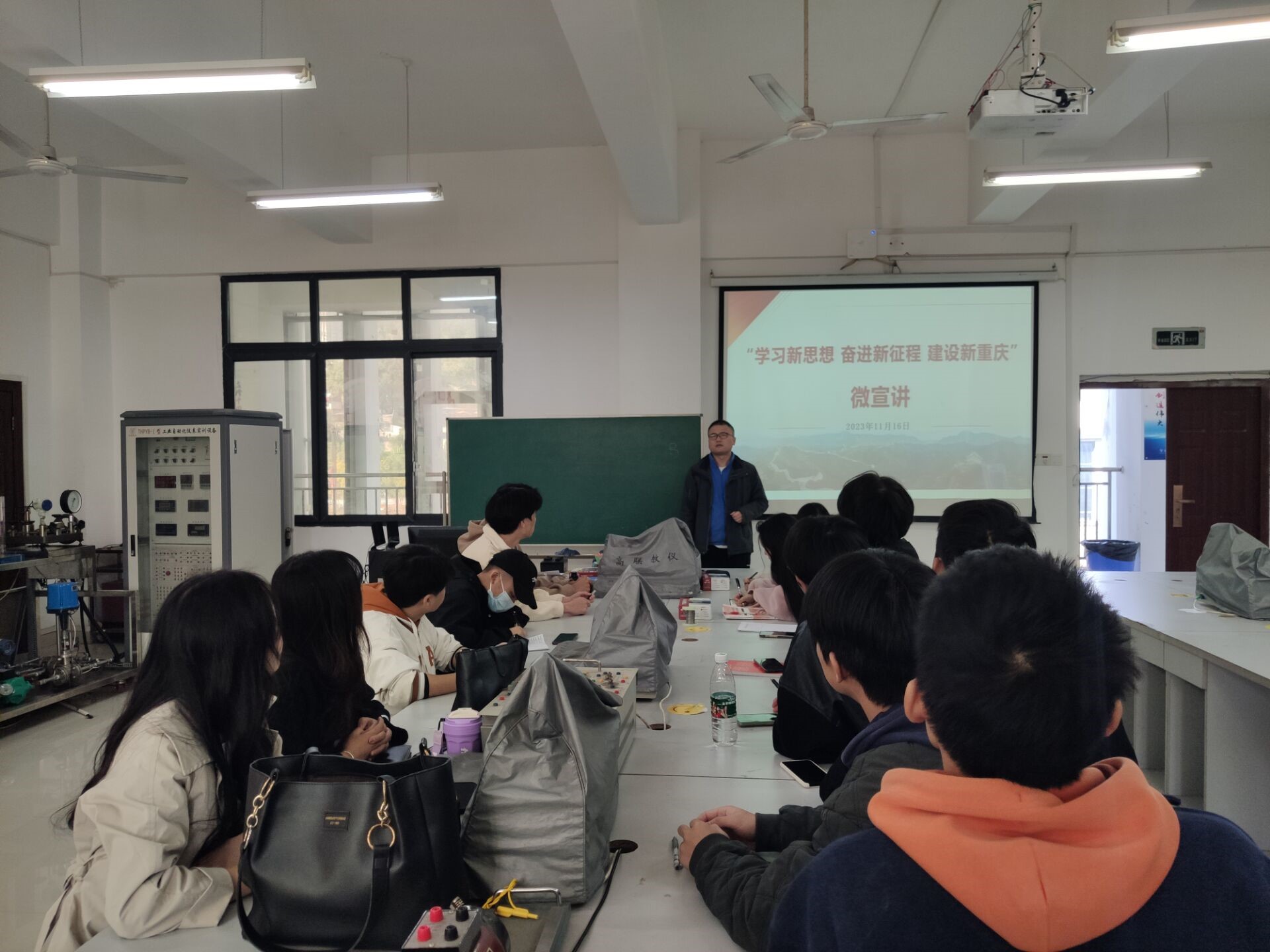 为深入学习贯彻党的二十大精神,全面贯彻落实市委六届三次全会精神,汇聚起新时代奋进新征程建设新重庆的强大精神力量,11月16日,智能制造学院党总支第三支部支部书记赵伟以“学习新思想 奋进新征程 建设新重庆”为主题,在奥训楼206教室为党支部的预备党员和入党积极分子开展了微宣讲活动。