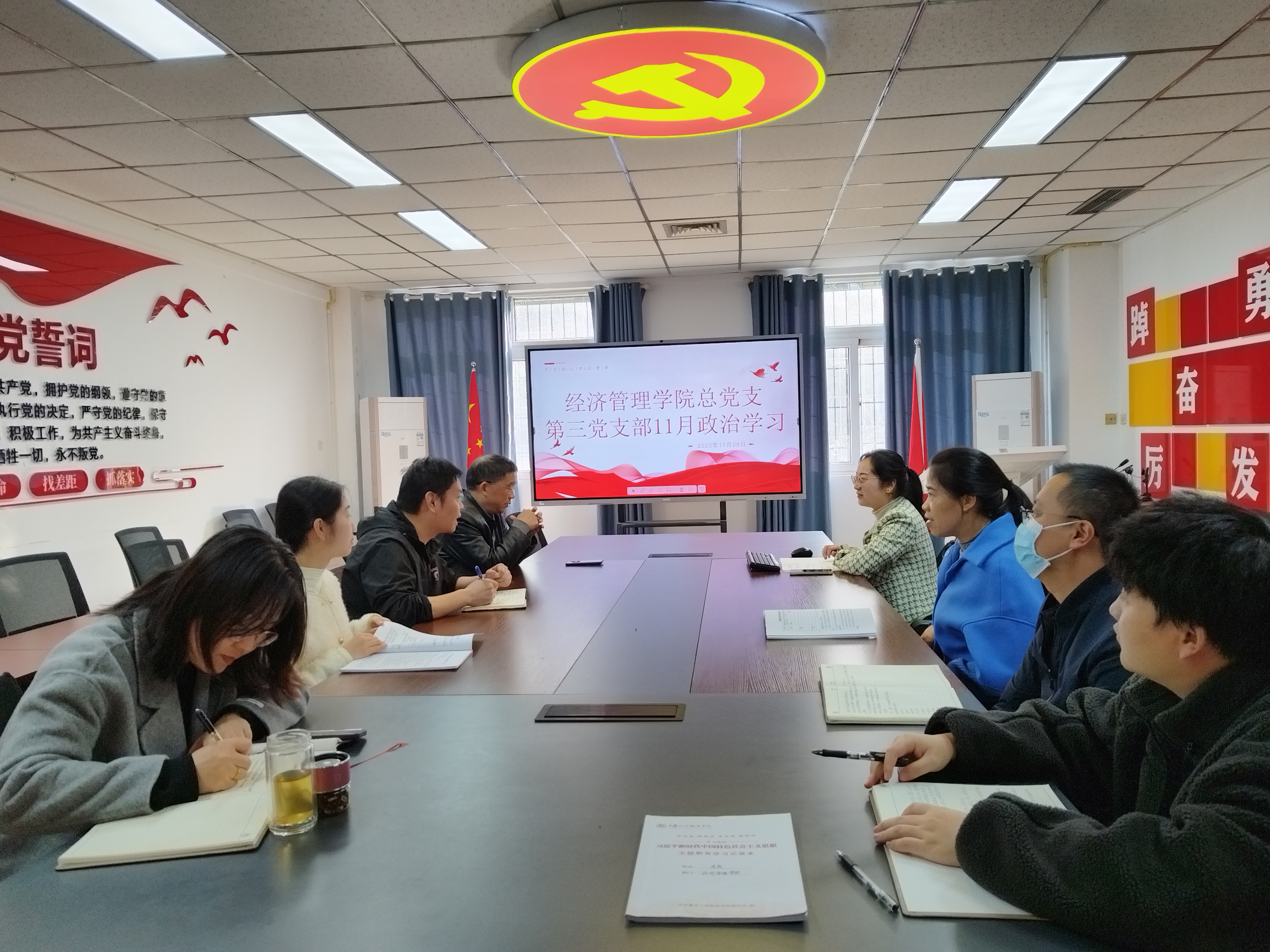 11月28日下午,经济管理学院党总支第三党支部在沙龙校区综合楼二楼会议室开展11月政治理论学习,会议由支部书记孙立芳主持,支部全体党员参加学习。
