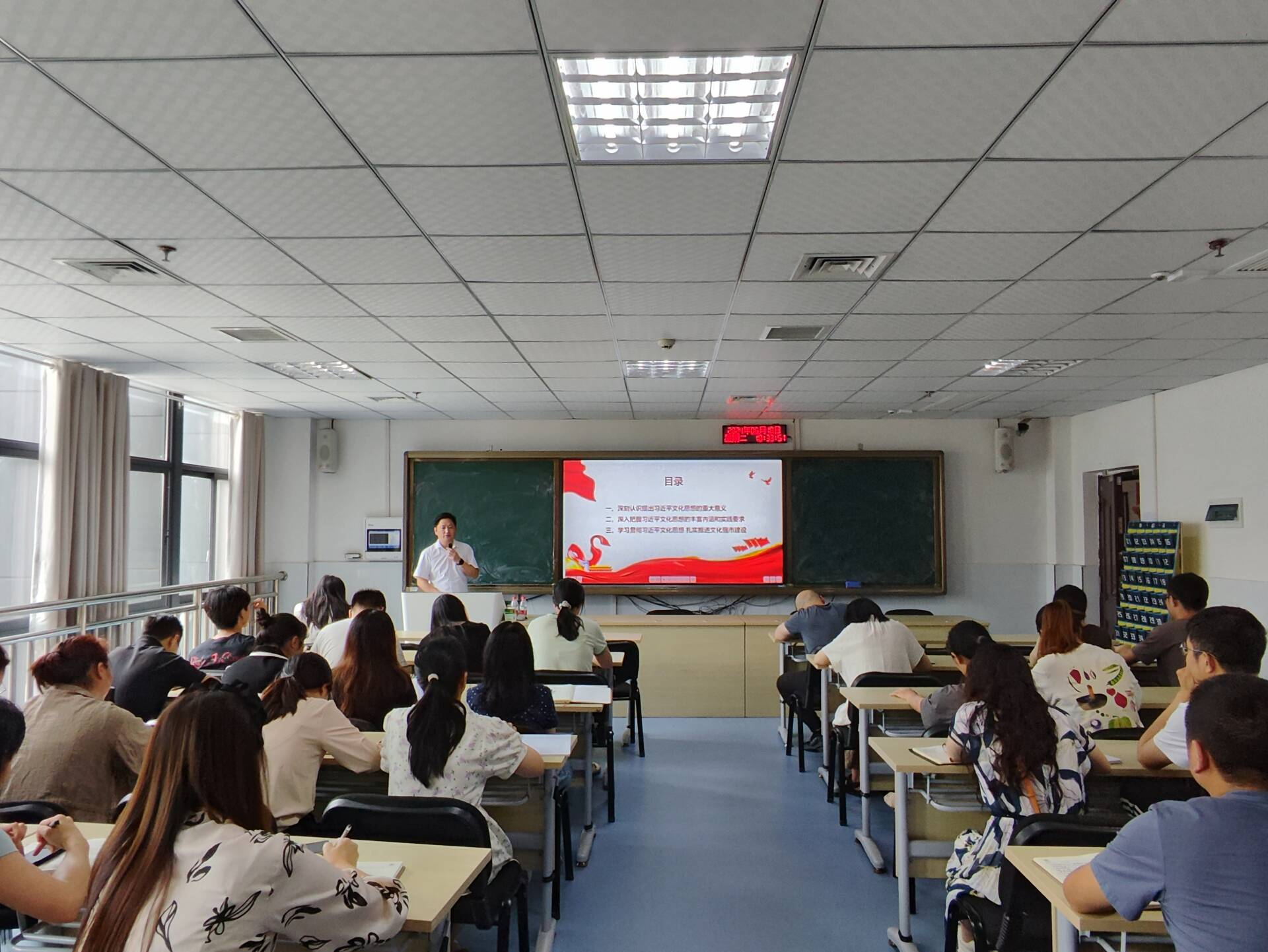 张传师副院长围绕“深刻认识提出习近平文化思想的重大意义”、“深入把握习近平文化思想的丰富内涵和实践要求”、“学习贯彻习近平文化思想扎实推进文化强市建设”三个方面对习近平文化思想的精髓要义进行深刻阐述。他强调,习近平文化思想丰富和发展了马克思主义文化理论,为做好新时代新征程宣传思想文化工作、担负起新的文化使命、创造人类文明新形态提供了强大的思想武器和科学的行动指南。全体教职工要深刻把握新时代新的文化使命,以习近平文化思想为指引,以高度的文化自觉担负起新的文化使命,把坚定的文化自信转化为实际行动;凝心聚力,奋楫笃行,为推进中国式现代化注入文化动力,为扎实推进文化强市建设贡献智慧。