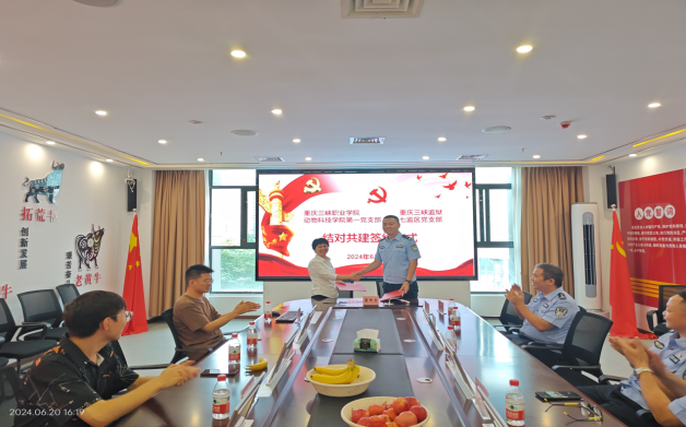 共建交流会上,母治平同志介绍了支部的基本情况、优势特色、党建工作等开展情况,就师生发展、专业建设、样本支部等方面展开交流,表示希望双方党支部在党建工作中紧密联系、加强交流,组织开展高质量的支部共建活动。重庆三峡监狱七监区党支部书记张关金同志表示,基层党支部结对共建是贯彻落实党的二十大精神的具体举措,是加强基层党支部建设的创新方式,有助于党支部之间进行经验交流、资源共享,希望双方党支部以支部共建活动为纽带,加强联系,整合资源,形成“合作共享”的党建互联共建格局。随后,动物科技学院“兽医先锋”第一党支部与重庆三峡监狱七监区党支部进行了结对共建签约仪式。