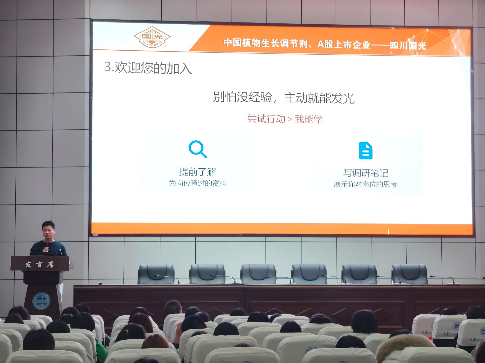 宣讲环节中,四川国光农化股份有限公司营销中心部长谢传高以企业发展为主线,系统介绍了公司的成长历程,直观展现了企业的综合实力与行业影响力。同时,谢传高部长详细解读了公司的业务布局,并结合行业趋势分析了企业未来的发展前景,以及为新员工设立的晋升通道。