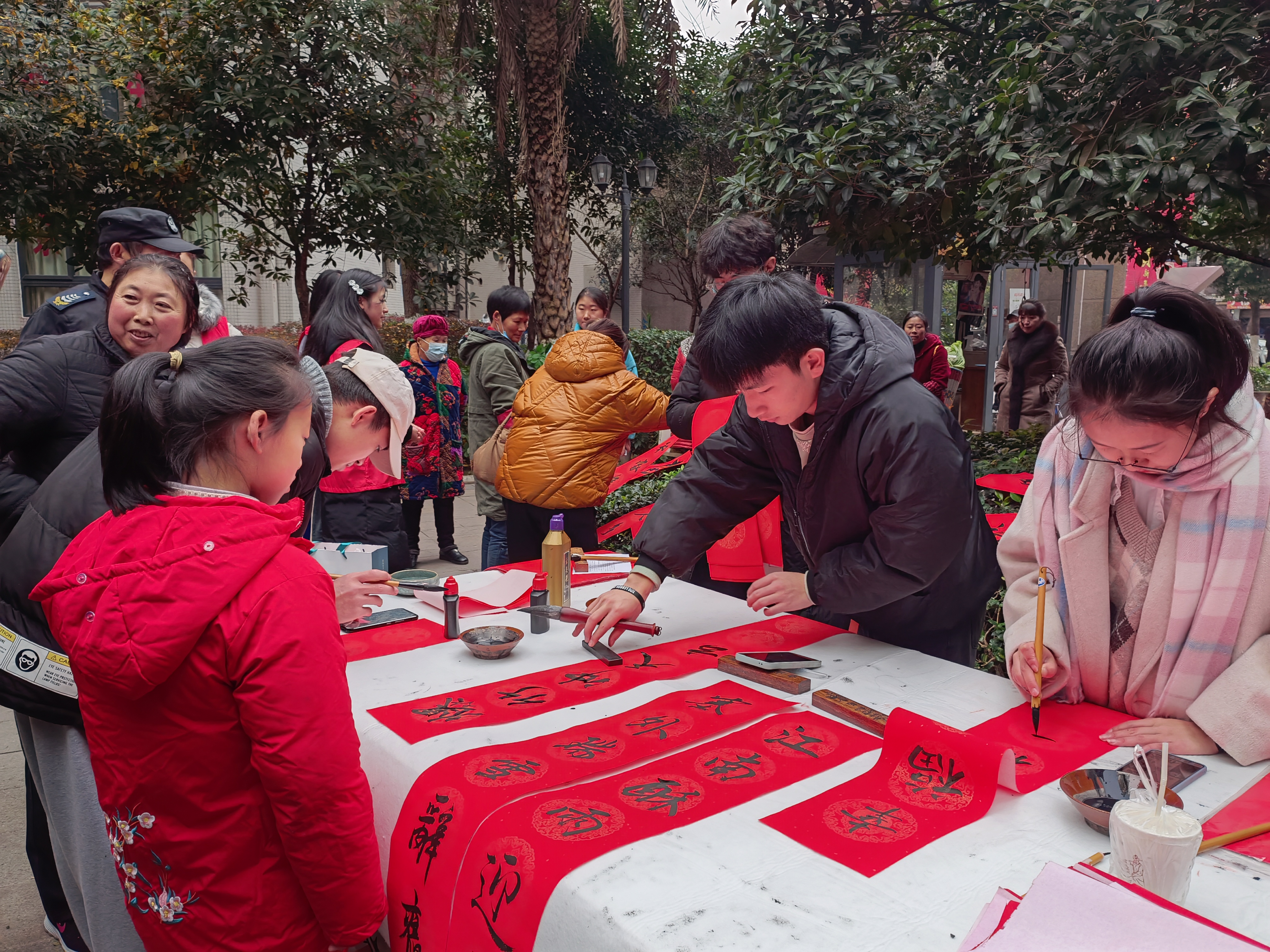 当志愿者们布置好场地后,立刻引起了社区居民的注意,我院志愿者们一展身手,一笔一划顿挫有力,吸引了不少社区居民前来观看。志愿者们铺开红纸、蘸好笔墨、凝神聚气,在红彤彤的纸上,写下了一幅又一幅苍劲有力、潇洒自如的“福”字和春联。许多居民排队领取对联,喜悦之情溢于言表,纷纷为我院学子风采点赞。