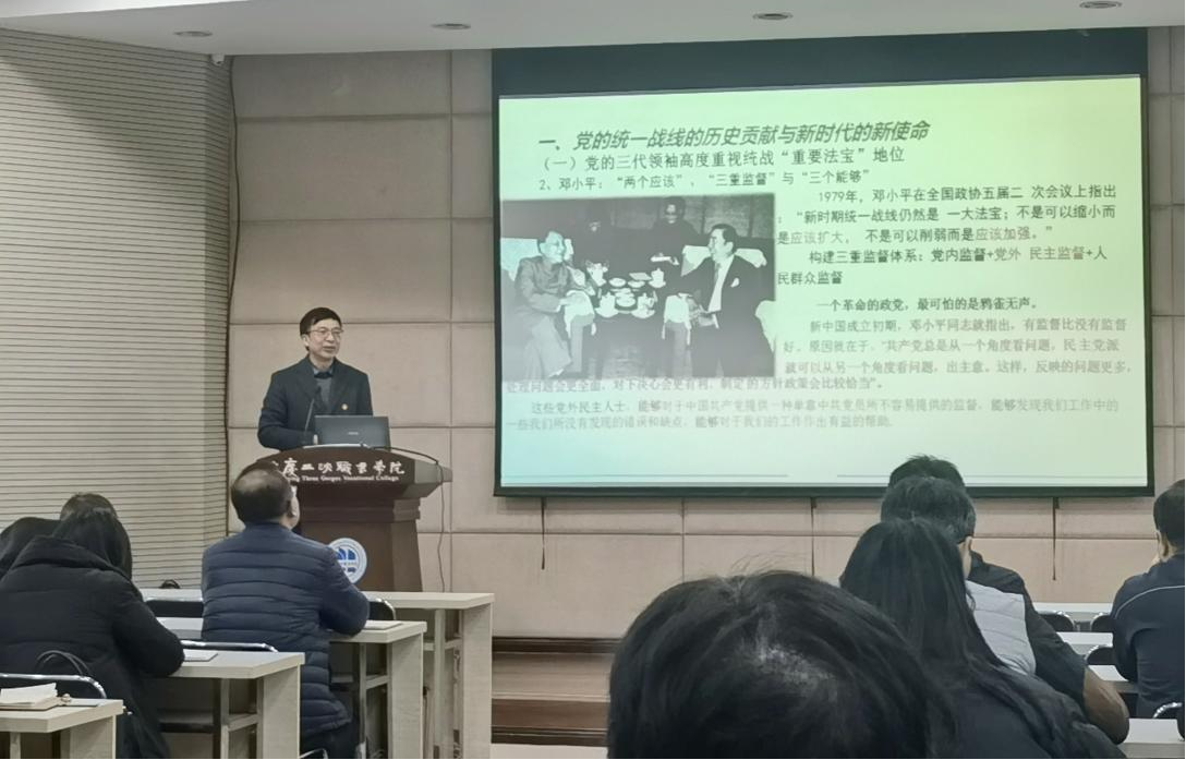 杨吉林从两个方面对《中国共产党统一战线工作条例》进行讲解。一是党的统一战线的历史贡献与新时代的新使命。讲述了毛泽东、邓小平、习近平党的三代领导人是如何高度重视统一战线的“重要法宝”地位,在不同的历史时期,面对不同的历史任务,如何运用统一战线取得巨大成功,以及现在面对新时代的历史使命,该如何发挥统一战线的独特优势,汇聚全社会的智慧和力量来建成社会主义现代化强国。二是《条例》修订的主要内容、重要意义及如何贯彻落实。系统地阐述了《条例》的核心要义,特别是对高校统一战线各领域的新要求、新表述。强调“一分部署,九分落实”,要求各级党组织对照《条例》提出的新规定、新标准、新要求,细化实化工作举措,找差距、补短板、强弱项,确保《条例》执行到位、落实到位。