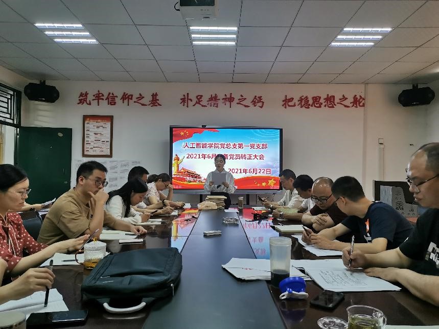 6月22日,人工智能学院党总支第一党支部召开2021年6月预备党员转正大会。人工智能学院党总支第一支部17名教师党员参加会议。会议由支部书记袁枫主持,对胡雨等7名预备党员发展为中共正式党员进行讨论和表决。