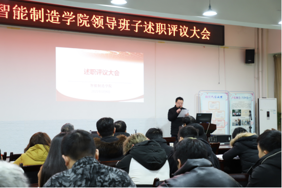 1月6日,智能制造学院在奥训楼308召开了2020年度智能制造学院领导班子述职评议大会。学院党委书记陈章,党委委员、副院长张智,部分教师代表和学生代表参加会议。会议由党委委员、组织统战部部长杨吉林主持。