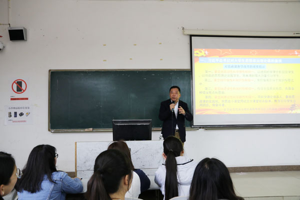 陈章书记主要围绕思想政治理论课作为立德树人的关键课程这一主题,从六个方面与师生进行了交流。首先陈书记从思想政治理论课的地位、习近平总书记对思想政治理论课教师的殷切希望、对教学改革的重要指示等方面谈到了习近平总书记对大学生思想政治理论课的重视,思政课作为意识形态工作、宣传思想工作、思想政治工作的重要组成部分,是落实立德树人根本任务的关键课程。紧接着陈书记从习近平总书记对青年大学生的希望谈起,希望大学生在“拔节孕穗期”的关键阶段,要扣好人生第一粒扣子,通过勤学、修德、明辨、笃实练好内功,并结合自身实际和大量鲜活的事实,说明了青年人在国家和社会中的地位,希望同学们将勤奋学习当作青春远航的动力,将增长本领当作青春搏击的能量,勇担历史重任,做中华民族伟大复兴中国梦的践行者和贡献者。此外,陈书记又讲述了大学思政课设置的历史沿革,“05方案”出台的背景以及党和国家对思政课教学重视,他谈到国家无论从宏观指导、教材的编写和使用、教师队伍建设、教学方法指导等方面都提出了顶层设计和具体实施办法,就是为了办好这门课程,提升思政课内涵,给学生心灵埋下真善美的种子。最后,陈书记强调了学院对思政课建设的重视和措施,不但从经费、组织、师资队伍方面给予了充分保障,还要把教师队伍入口关、出口关、培养关,深化教学改革,提高思政课教学质量和水平。希望通过打造铸魂育人的“金课”,帮助学点亮理想的灯,照亮前行的路。
