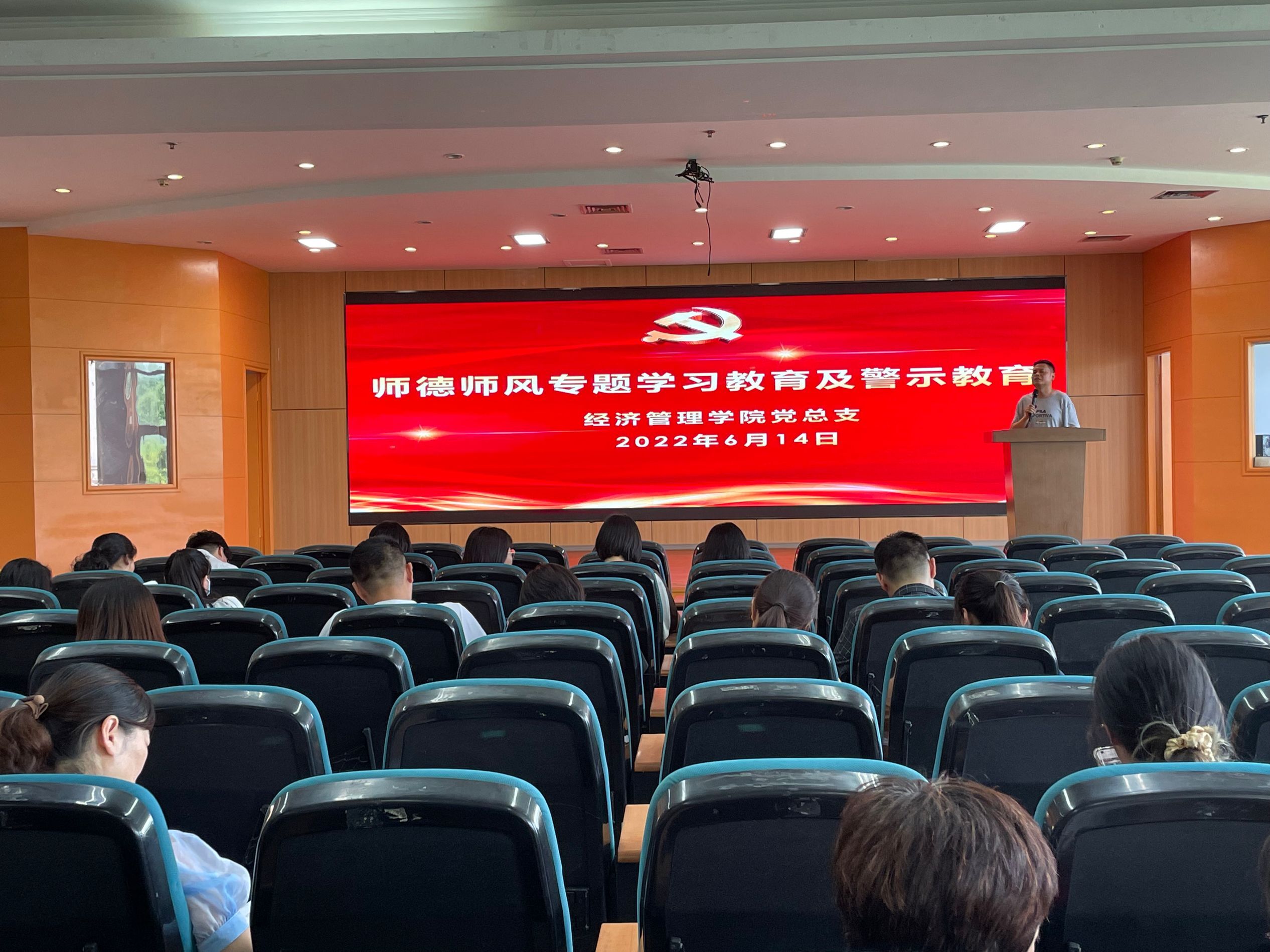 6月14日下午,经济管理学院党总支在沙龙校区综合楼2楼学术报告厅召开了经济管理学院师德师风专题学习及警示教育学习大会,全体教师参加学习。