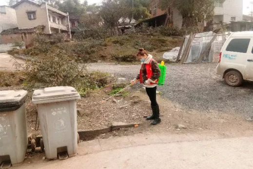陈攀渝的主要工作是为村庄进行消毒杀菌。在跟随有关工作人员学习了消毒杀菌相关卫生防疫知识、消毒器材操作规范和防护安全注意事项后,她定期同村委员会工作人员一起背上喷雾器为村庄消毒杀菌。