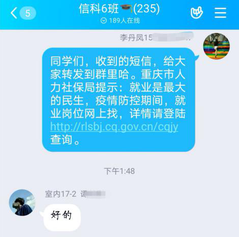 落实停课不停教要求,切实做好毕业班就业辅导。因疫情影响,许多线下招聘活动取消或延期,李丹凤注册智联招聘、BOSS直聘等求职类APP软件,线上收集就业信息,并及时向学生推送。李丹凤还结合学生日常咨询问题和关注点位,引导学生制定合理的职业生涯规划和就业方向。对于部分就业困难的学生,针对性地开展线上就业辅导,尽所能缓解学生就业焦虑情绪。