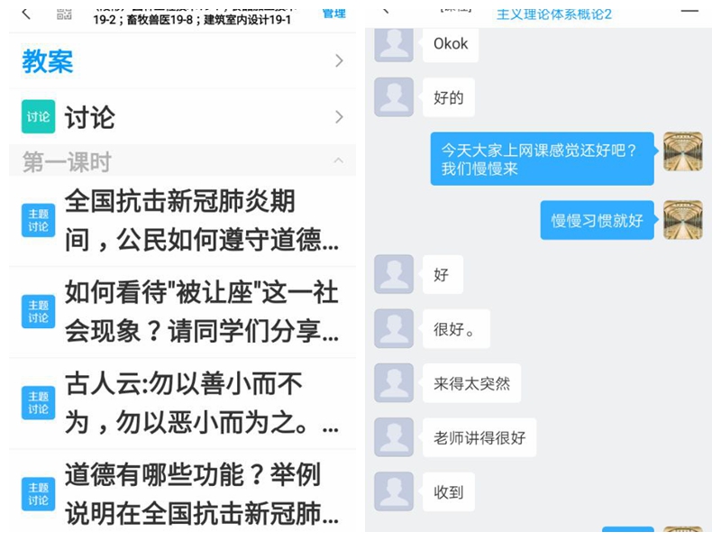 2月17日下午,马克思主义学院线上思政课正式开课,教师采取线上讲解、答疑、主题讨论、课堂测试等形式开展教学活动。别开生面的教学形式吸引了学生的兴趣,也激发了学生学习的热情。第一天上课有10位教师开通网络课堂,共计800多名学生参加学习。其中,教师们通过党中央应对新冠肺炎的举措为主题,引导学生热烈讨论,以加强学生爱国主义教育,激发学生强烈的爱党爱国爱社会主义情怀。
