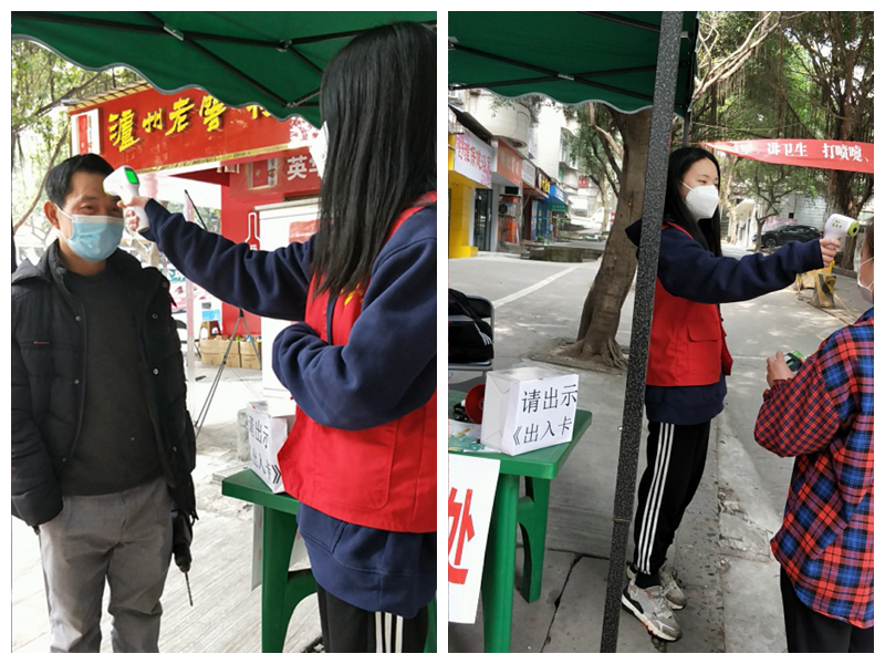 自2月1日起,陈自汇先后在四川自贡市的连锁超市和梨园小区担任志愿者。她的主要工作是测量进入超市和小区人员的体温,登记外来人员信息,上门排查是否有疑似症状人员,进行疫情防控宣传,线上询问居民身体状况,帮助住户实现无接触收发快递、超市外卖。