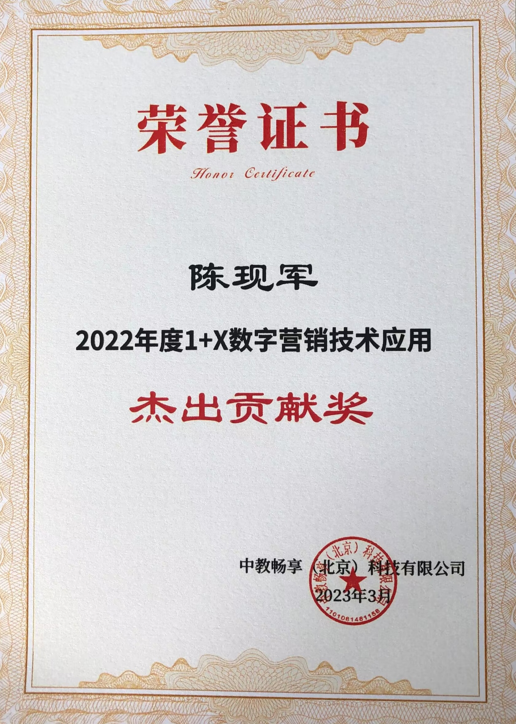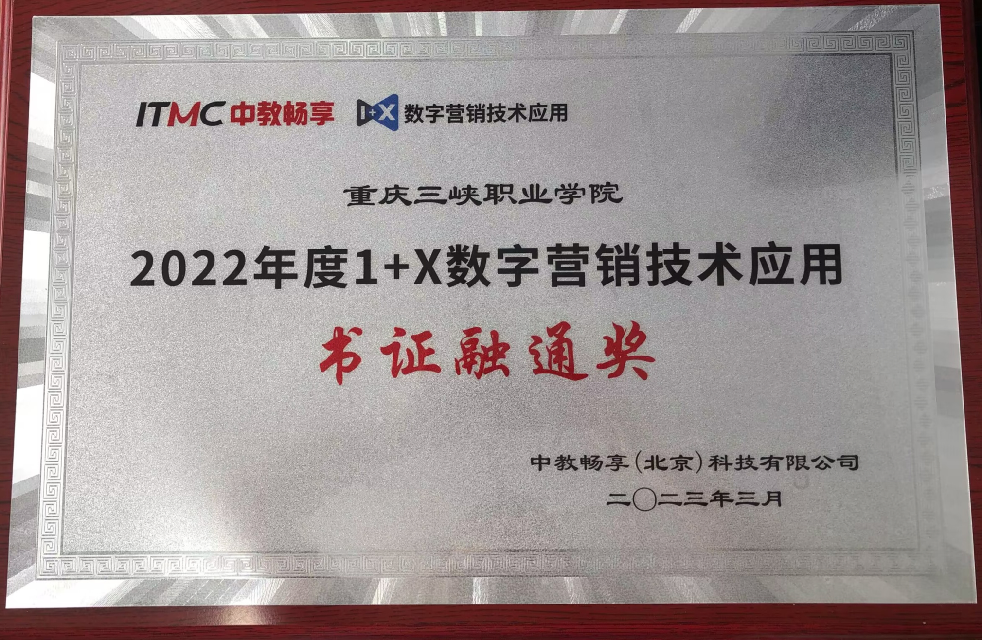 近日,1+X数字营销技术应用评价组织中教畅享(北京)科技有限公司对在2022年“1+X数字营销”证书推进工作中做出重要贡献的试点院校与个人进行了集中表彰。我院在1+X数字营销技术应用工作中的卓越表现和突出成绩,被授予“书证融通奖”,经济管理学院副院长陈现军被授予“杰出贡献奖”,宋丽丽老师被授予“匠心育人奖”。