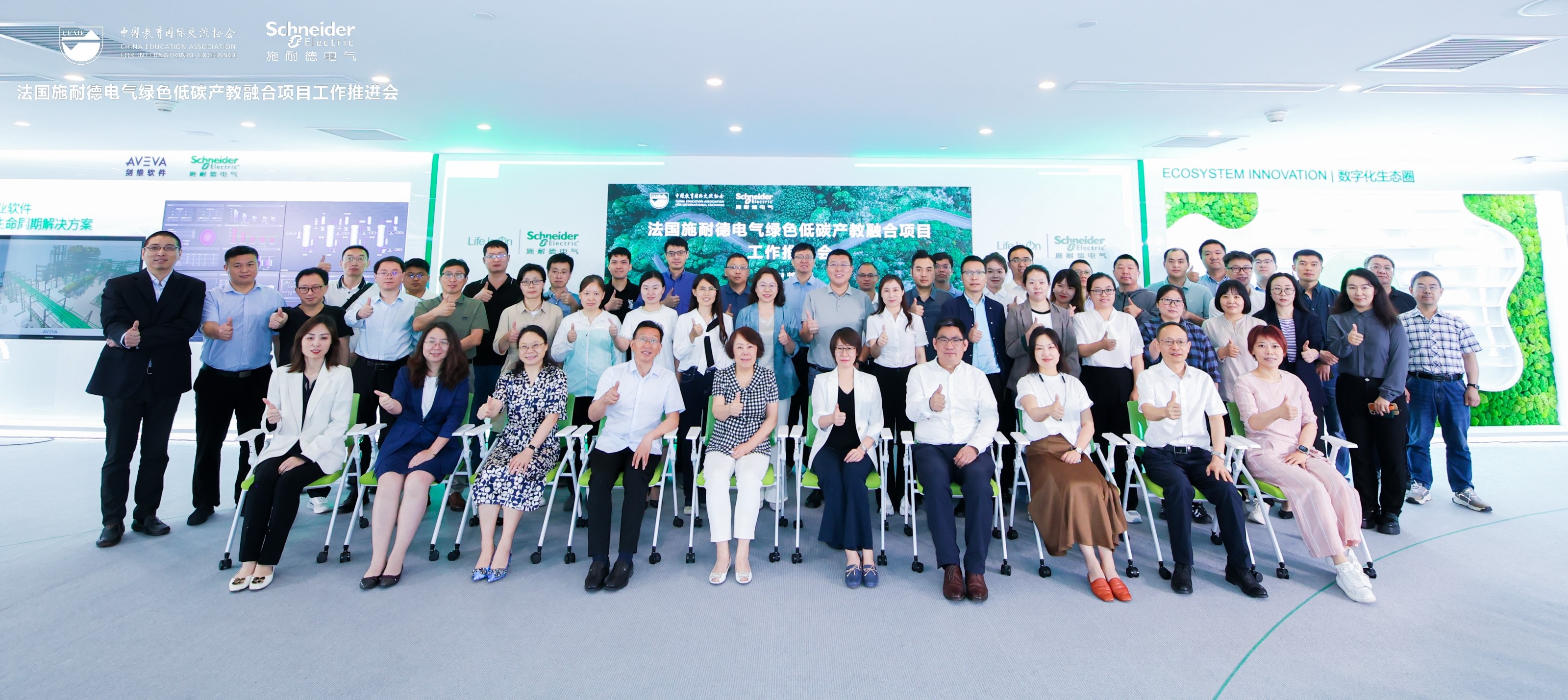 中国教育国际交流协会职业教育与培训部主任何培、施耐德电气中国区副总裁王洁、施耐德电气公共事务总监许屾、以及来自施耐德电气绿色低碳产教融合项目的全国24所项目建设高校领导和老师共50余人出席此次会议,会议由中国教育国际交流协会张俊卿主持。