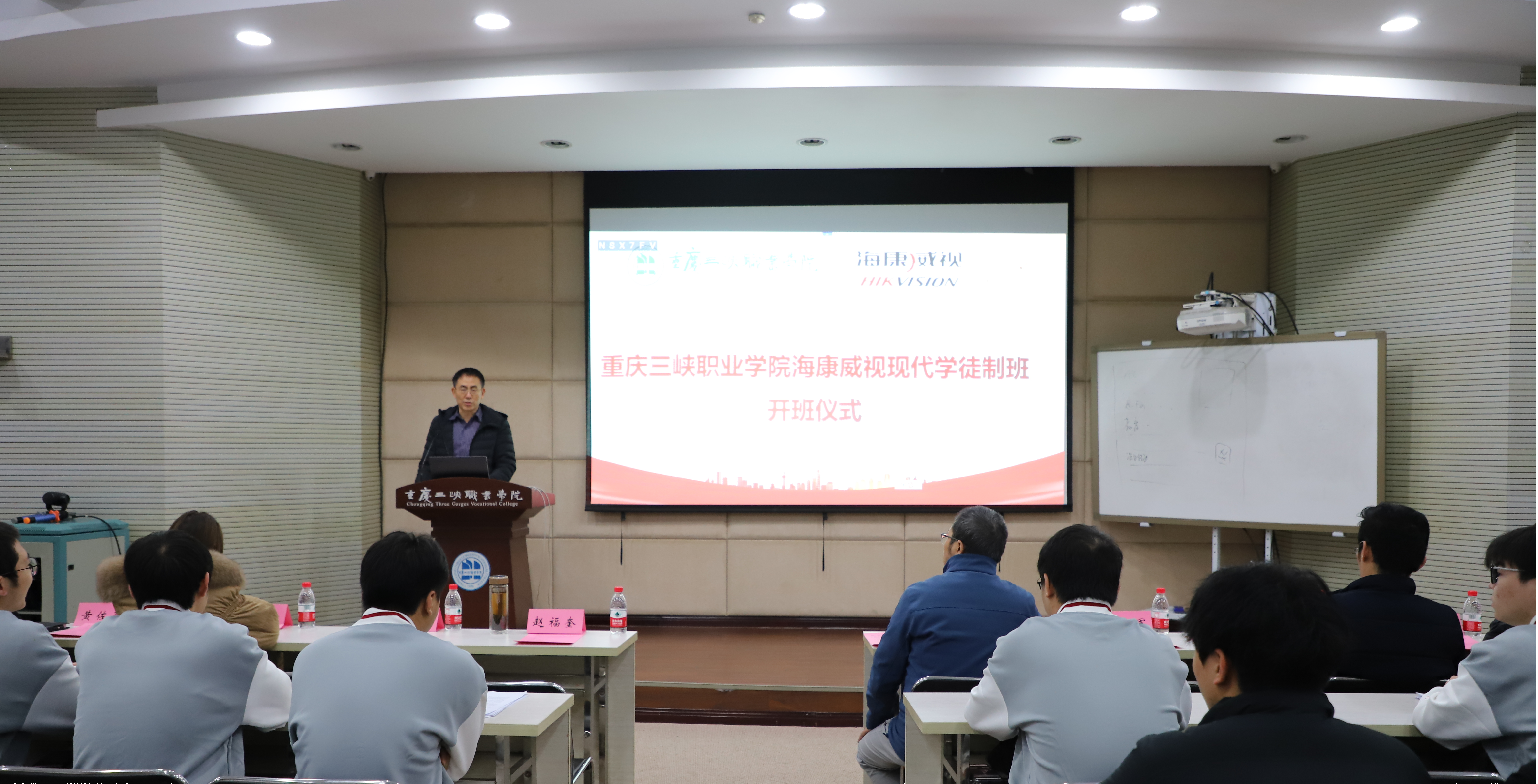 12月1日上午,海康威视现代学徒制班开班仪式暨拜师仪式在博雅楼207会议室举行。学院党委委员、副院长赵福奎出席会议,智能制造学院相关负责人、重庆海康威视科技有限公司代表、学徒制班的40余名同学以及2023级电子信息工程技术专业全体学生参加了仪式。仪式由智能制造学院党总支书记、院长熊江主持。