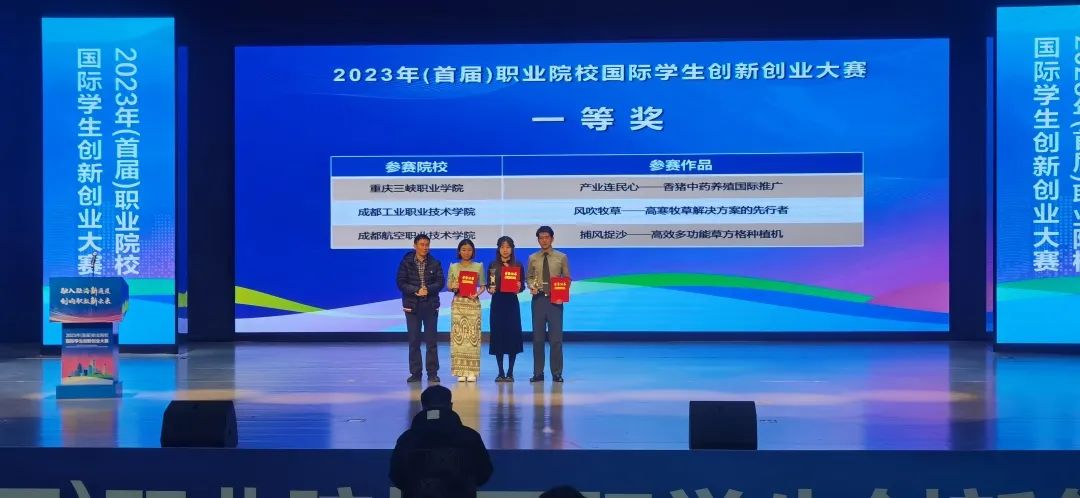 决赛采取现场路演答辩的方式进行,各项目分别展示后,评委专家根据项目展示内容提问,项目团队成员进行问题答辩。评委专家根据组委会公开的职教赛道评审细则进行评审,现场公布分数。经过激烈角逐,最终,重庆三峡职业学院《产业连民心——香猪中药养殖国际推广》、成都工业职业技术学院《风吹牧草——高寒牧草解决方案的先行者》,成都航空职业技术学院《捕风捉沙--高效多功能草方格种植机》3个项目获得大赛一等奖。锡林郭勒职业学院的《名“羊”天下——育世界名羊,兴中国羊业》等5个项目获得大赛二等奖。重庆工业职业技术学院的《光影魔术师-机器视觉人造皮革品控创新系统》等6个项目获得大赛三等奖。