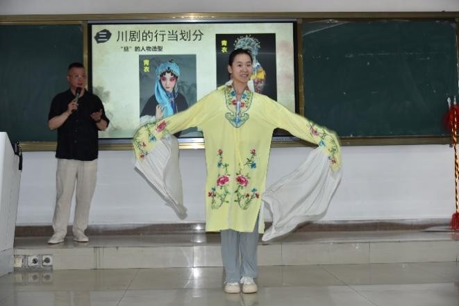 活动主讲人首先介绍了川剧的起源以及如何看懂川剧,他在以“川剧的行当划分”为题为学生详细介绍了川剧的角色行当和基本的表演程式,并现场邀请学生进行上台体验。随后,小生和花旦两位专业演员现场为学生演示了川剧唱腔、动作;打鼓配乐的老师演奏了戏剧不同场景的鼓点,让学生倾听了不同乐器发出的美妙声音。学生纷纷表示,以往一直认为川剧这种传统文化离他们很遥远,没想到戏剧走进了课堂,近距离感受到了戏剧的魅力。