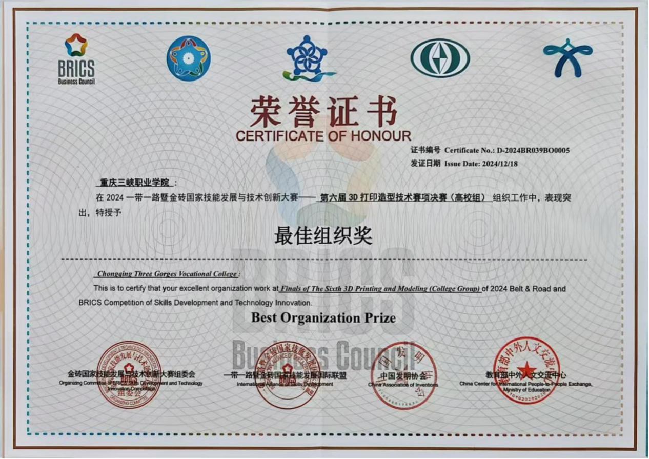 12月18日,2024一带一路暨金砖国家技能发展与技术创新大赛第六届3D打印造型技术全国总决赛圆满落幕。智能制造学院竞赛团队在比赛中荣获一等奖、优秀指导教师奖以及最佳组织奖。