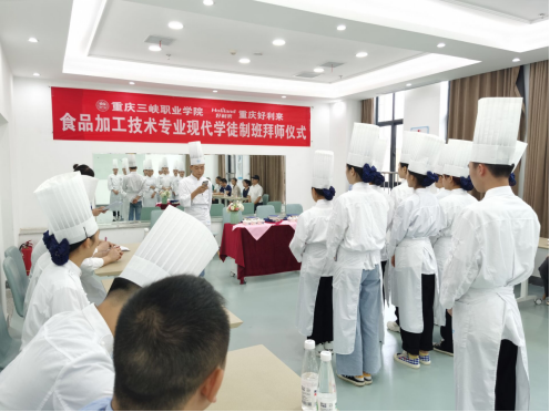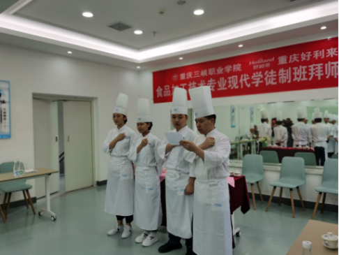 7月9日,我校农林科技学院党总支副书记陈吉裕、食品加工技术现代学徒制教研室主任崔俊林,辅导员汪子恒带领12名学徒制班学生前往重庆好利来中央工厂生产培训部会议室参加拜师仪式暨学生轮岗定级实习启动仪式。