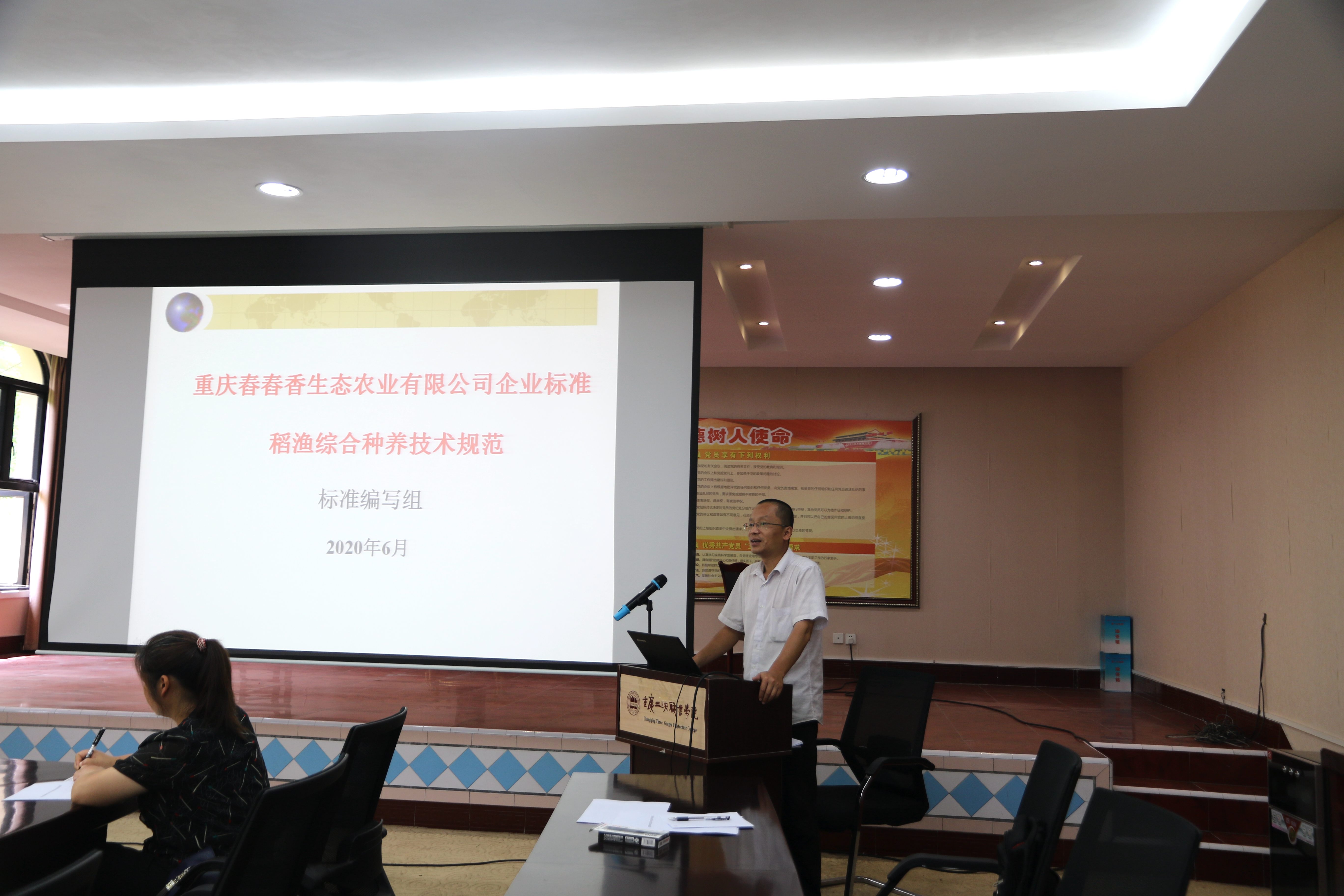 学校稻渔创新团队张超博士代表课题组汇报了编写情况。专家组查阅相关资料,经研究和讨论,认定该标准规定了重庆舂舂香生态农业有限公司稻渔生产过程中稻田选择、基础设施、水稻种植、品种选择、生产管理等方面的操作规范,引用的规范性技术文件现行有效,编写内容科学、完整,可操作性强,能够指导企业规范发展,提质增效。专家组一致同意该标准按相关程序报备实施。