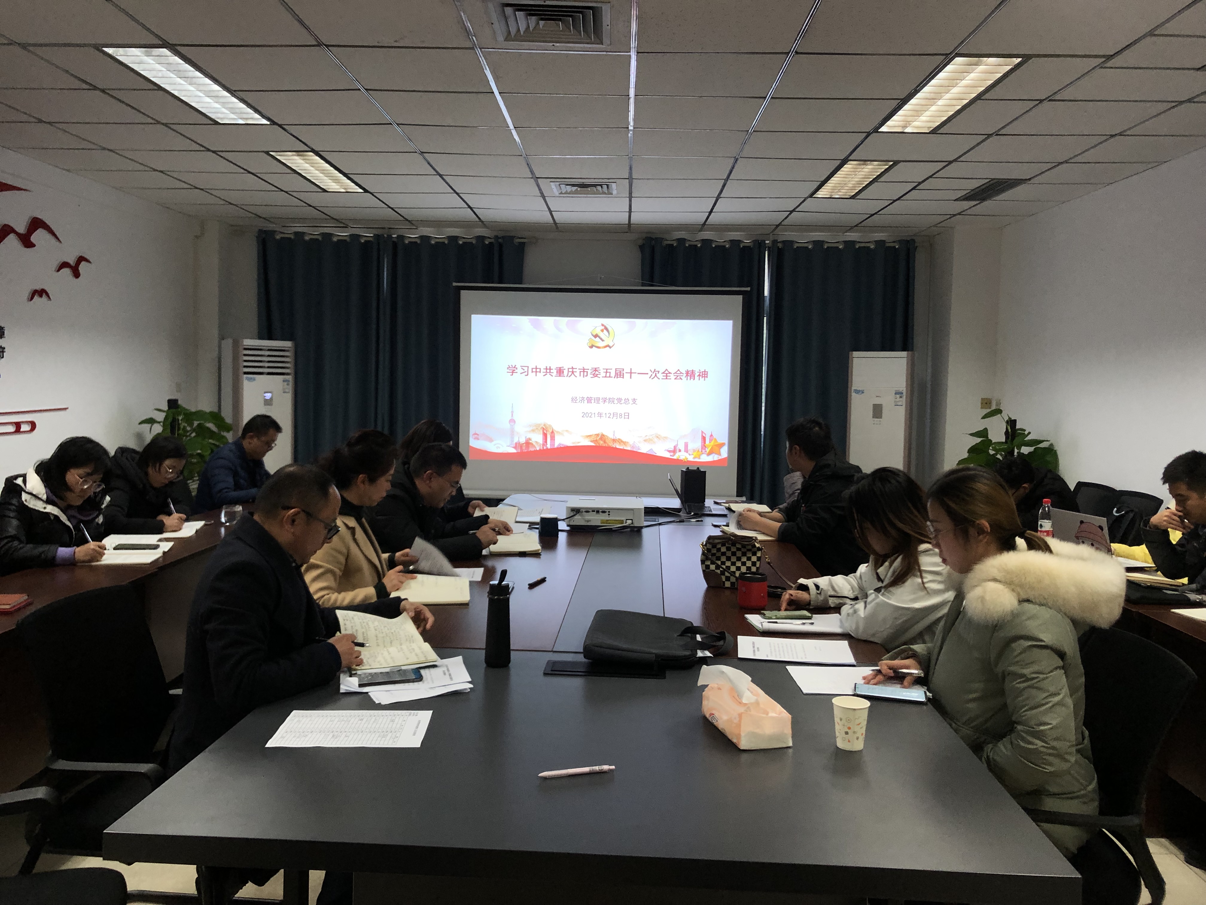 专职组织员李静领学了《中共重庆市委五届十一次全会会议精神》。赵琳强调,全体教职员工要坚决贯彻市委五届十一次全会部署要求,学懂、弄通、悟透党的十九届六中全会精神,把学习领会党的十九届六中全会和市委五届十一次全会精神的成果,转化为谋划当前和今后一个时期经济管理学院工作的新思路、新举措,推动学院高质量发展。
