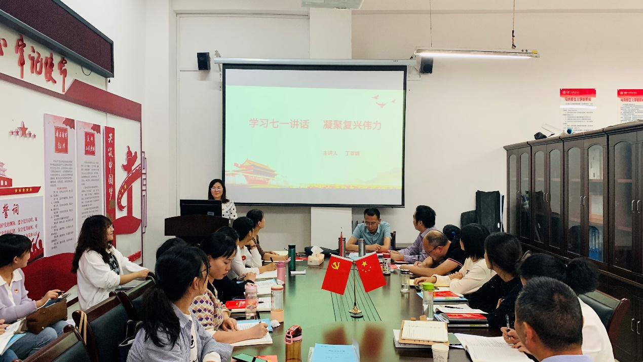 党支部副书记丁翠娟为全体党员上党课,她以《学习七一讲话,凝聚复兴力量》为题,从充分认识“七一讲话”的背景意义、准确把握“七一讲话”的核心要义和贯彻落实“七一讲话”的实践要求等三个方面系统阐述了习近平总书记“七一”重要讲话,立足中国共产党百年华诞的重大时刻和“两个一百年”历史交汇的关键节点,回望光辉历史、擘画光明未来,是一篇马克思主义纲领性文献,是新时代中国共产党人不忘初心、牢记使命的政治宣言,是我们党团结带领人民以史为鉴开创未来的行动指南。最后,丁翠娟号召广大思政课教师要以史为鉴、立足岗位、不忘初心、奋发有为,为学院发展继续奋斗。