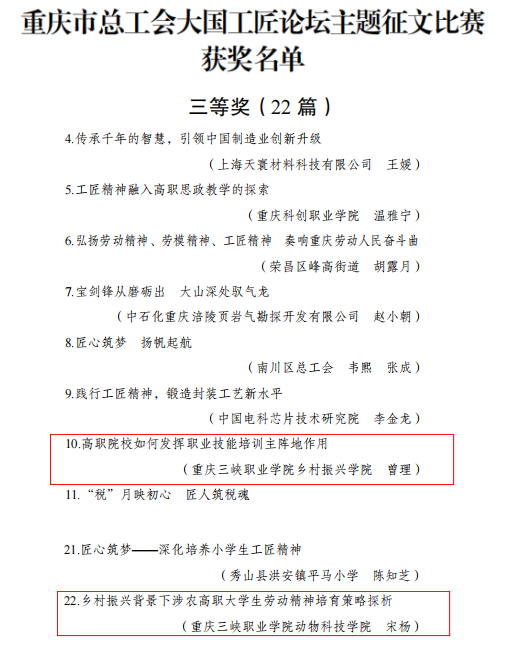 为认真贯彻落实习近平总书记致首届大国工匠创新交流大会贺信精神,广泛宣传培育大国工匠的经验做法和工匠人才的先进事迹,进一步激励全市广大职工走技能成才、技能报国之路,按照全国总工会有关通知要求,重庆市总工会在全市范围内组织开展了“匠心逐梦、强国有我”大国工匠论坛主题征文比赛。经专家学者严格评审,我院工会委员会选送的培训学院(乡村振兴学院)曾理院长撰写的《高职院校如何发挥职业技能培训主阵地作用》和动物科技学院宋杨老师撰写的《乡村振兴背景下涉农高职大学生劳动精神培育策略探析》荣获三等奖。