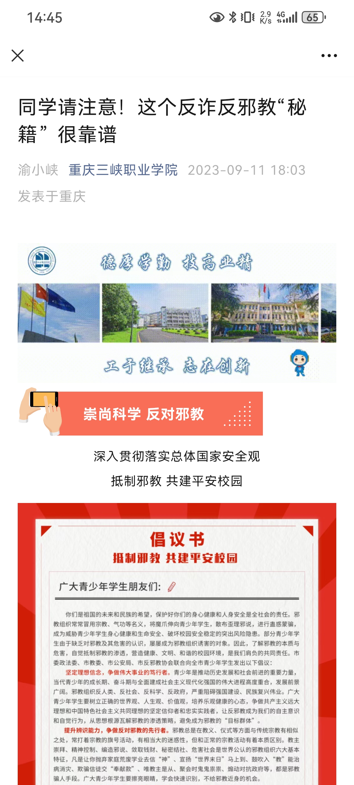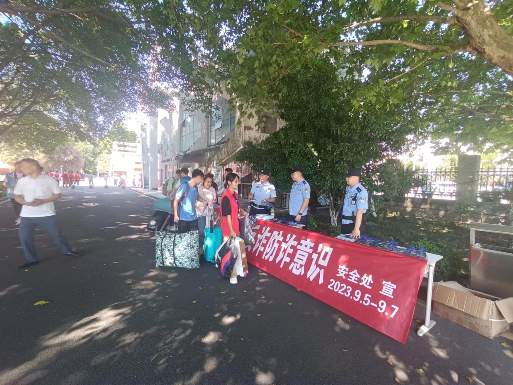 一是通过秋季开学第一课、新生入学安全教育讲座及在学校官方微信公众号推出反诈反邪教“秘籍“等方式,将预防电信诈骗、反邪教等纳入重点内容进行学习,同时在校内悬挂安全宣传横幅8幅,更新安全宣传栏2块,展出安全宣传展板10余块。