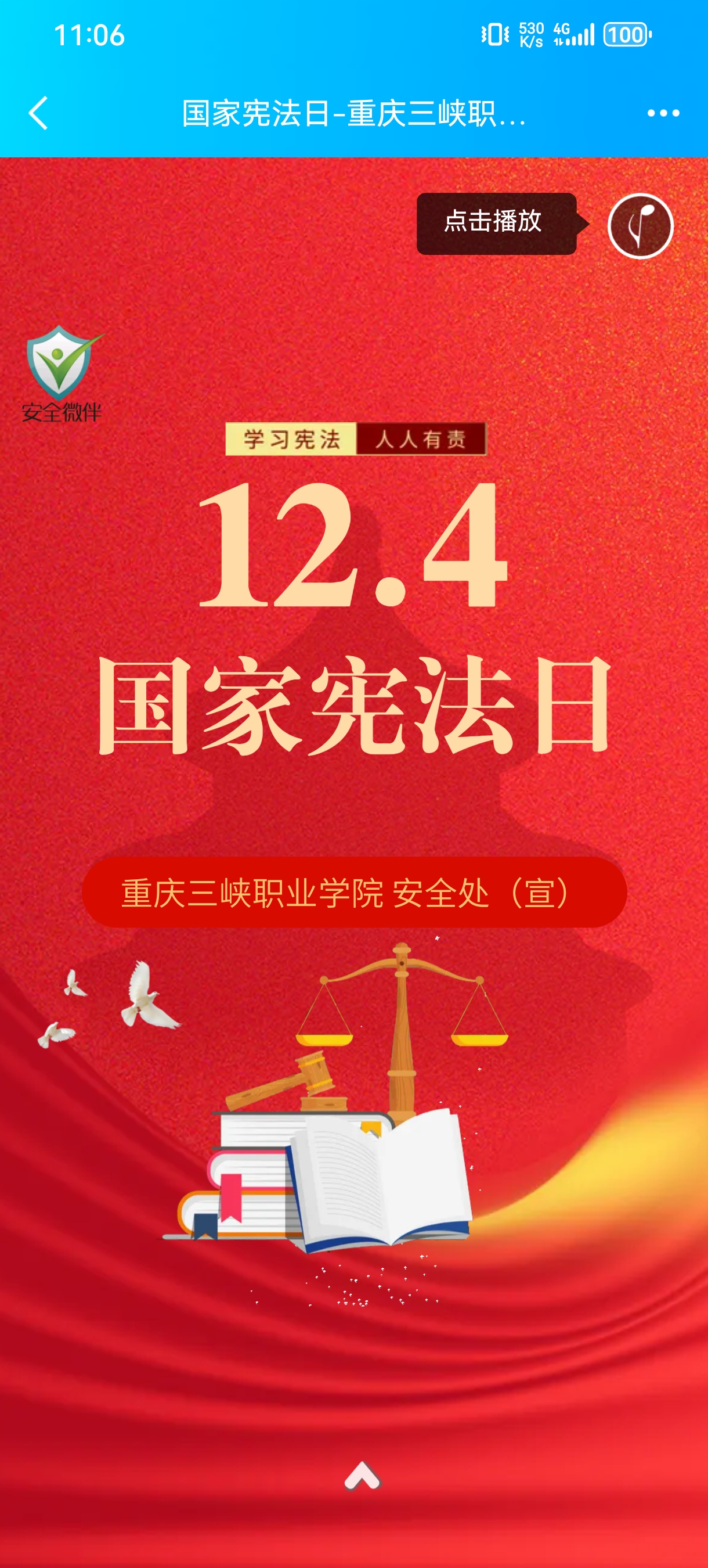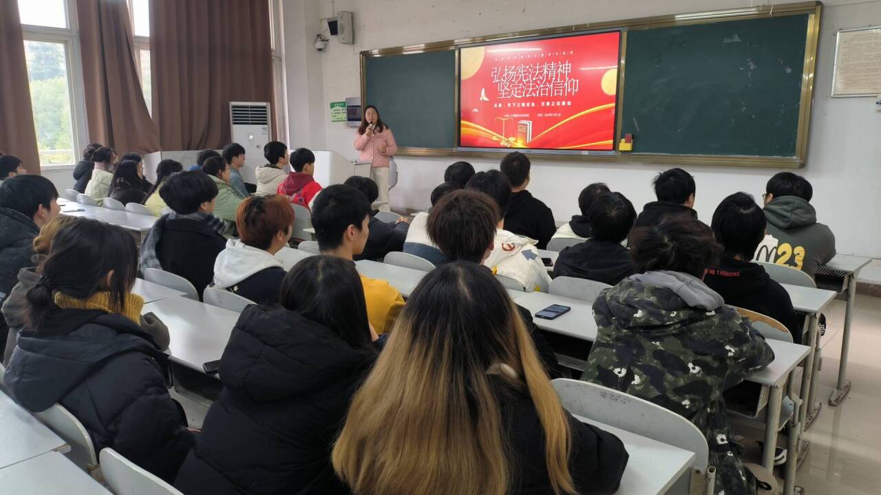 三是以“大力弘扬宪法精神,建设社会主义法治文化”为主题,开展12.4国家宪法日宣教工作。组织各二级学院、各部门做好师生的宪法宣传教育工作,各班级开展好宪法学习主题班会,弘扬宪法精神,提高法律意识,增强法治观念。