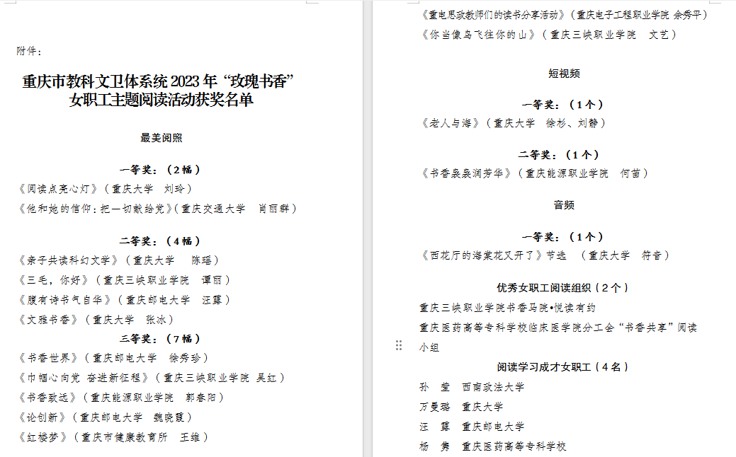 为进一步做好女职工思想政治引领工作、促进女职工素质提升、持续推进家庭文明建设,重庆市教科文卫体工会组织开展了“玫瑰书香”女职工主题阅读活动。学院工会委员会积极组织,得到了各工会小组大力支持和女教职工的积极响应,共推荐10件优秀作品参赛。