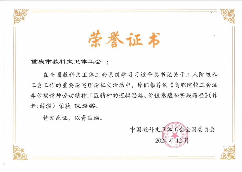 为深入学习贯彻习近平总书记关于工人阶级和工会工作的重要论述,推动习近平总书记关于工人阶级和工会工作的重要论述的学习、研究、阐释,中国教科文卫体工会全国委员会组织开展了学习习近平总书记关于工人阶级和工会工作的重要论述理论征文活动。学校工会高度重视、广泛发动,教职工踊跃参与、高质量投稿。经专家评委严格评审,学校汽车工程学院薛溢老师撰写的《高职院校工会涵养劳模精神劳动精神工匠精神的逻辑思路、价值意蕴和实践路径》在全国教科文卫体工会系统学习习近平总书记关于工人阶级和工会工作的重要论述理论征文活动中荣获优秀奖。