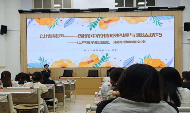 为丰富第28届全国推广普通话宣传周活动形式,提升学生的语言文化素养与语言表达能力,9月23日,通识教育学院特邀重庆三峡融媒体中心主任播音员、重庆市播音主持协会理事、重庆市十佳播音员主持人、万州区第六届政协委员谢丹老师,在信科楼220教室带来题为《以情带声——朗诵中的情感把握与表达技巧》的专题讲座。通识教育学院党支部副书记、副院长潘雪主持。