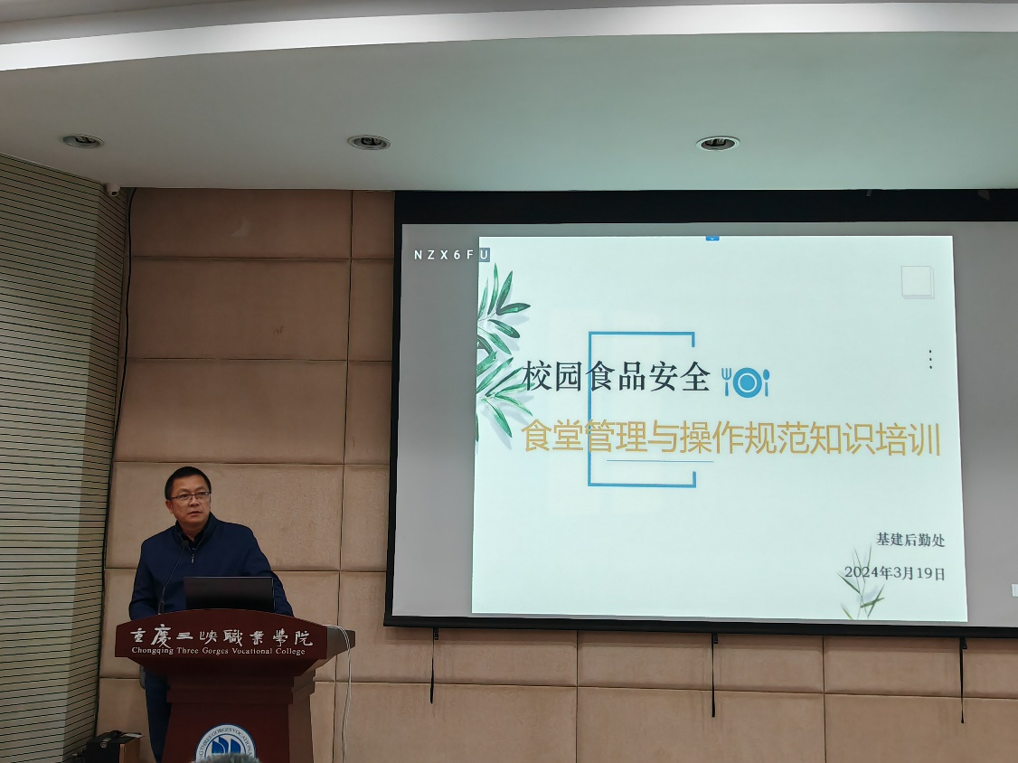 为进一步加强学院食堂食品安全管理,提高食堂从业人员的综合素质和食品安全意识,规范从业人员操作,保障师生的饮食健康安全。基建后勤处于3月19日在博雅楼207会议室组织开展2024年春季学期校园食品安全专题培训会。学院院长李炯光,副院长袁德梽,基建后勤处负责人、分管食品安全工作相关人员、各食堂经理、食品安全员、厨师长等共70余人参加培训。会议由副院长袁德梽主持。