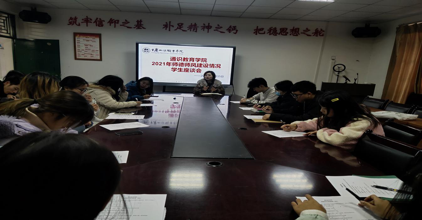为了全面加强师德师风建设工作,建设一支师德高尚、业务精良的教师队伍,我院于2021年12月15日星期三上午10:00在信科楼502举办了通识教育学院2021年师德师风建设情况学生座谈会。参与本次座谈会的人员有通识教育学院副院长潘雪和各二级学院的班级代表。