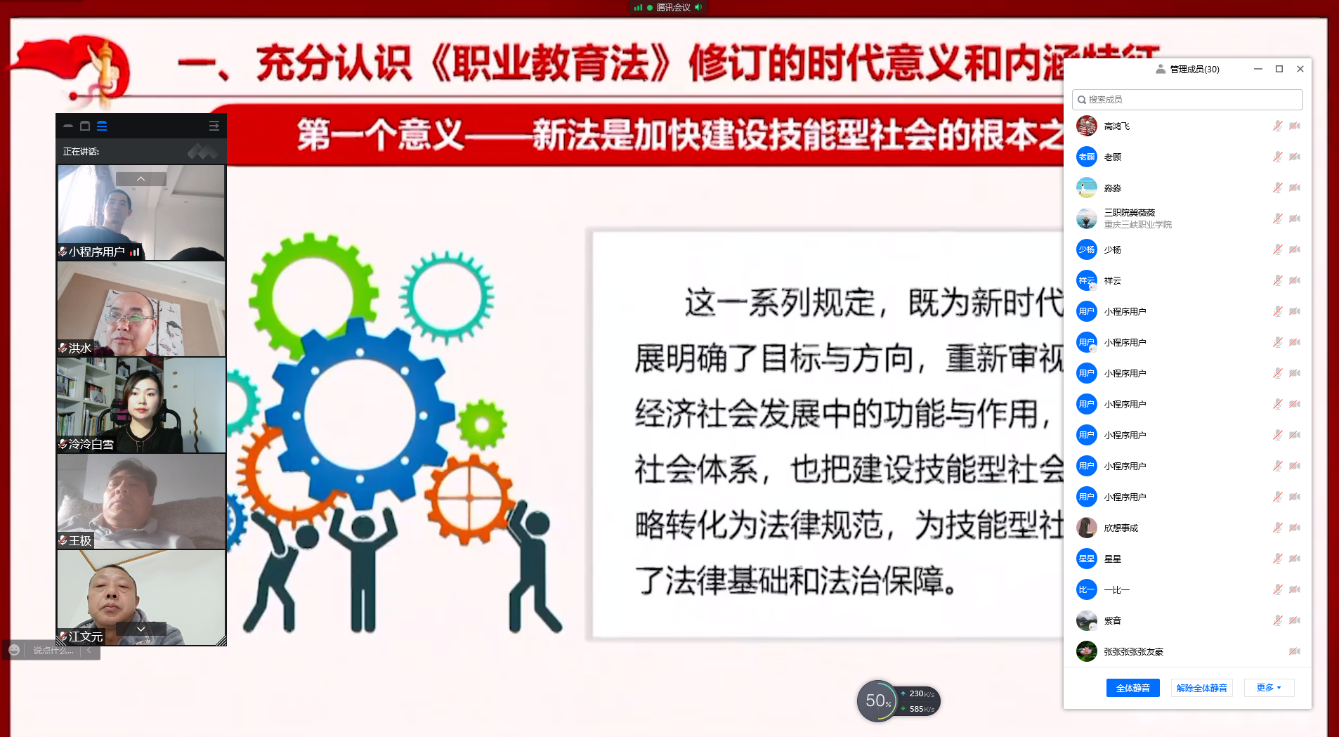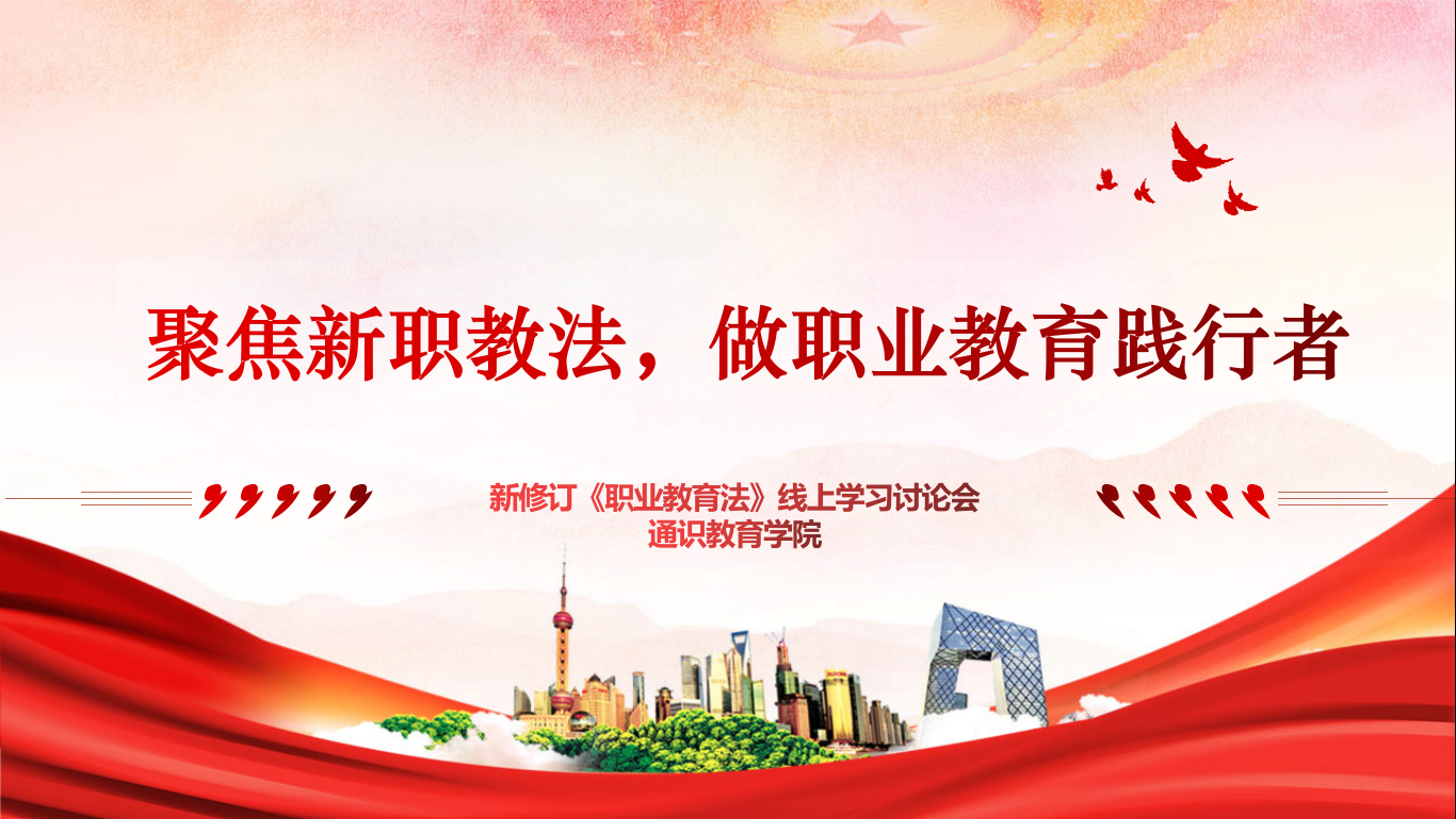 新修订的《中华人民共和国职业教育法》(以下简称“新职教法”)自2022年5月1日起施行。为全面贯彻新修订的《职业教育法》,加快学院高质量发展,我院于5月16日晚7点在腾讯会议召开通识教育学院《职业教育法》线上学习讨论会,以加强教职工对职业教育法的理解,明确修订意义、增强工作信心。本次会议由通识教育学院副院长潘雪主持,参加人员为通识教育学院全体教职工。