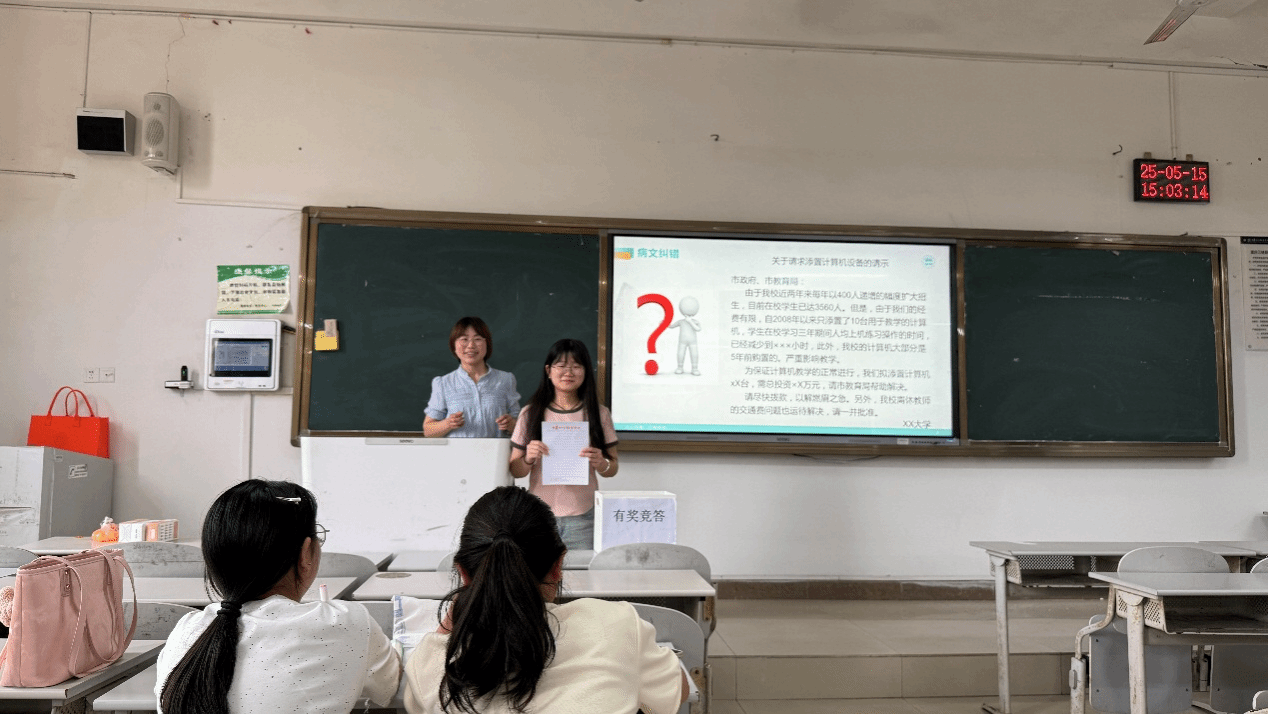 活动前期,宋洪老师精心准备“纠错盲盒”,内含合同、通知、报告等常见职场文书模拟样本,每份样本设置1-2处错别字、格式错误、标点误用或表述不当问题。5月16日上午,活动在学院博雅楼教室展开,让“大家一起来找茬”,参与学生以个人为单位抽取盲盒,通过4分钟限时阅读,启发学生开动脑筋,开展头脑风暴,积极运用所学知识,开展病文纠错。活动后宋洪老师对典型问题进行了集中点评,重点讲解职场文书中“定金”与“订金”“报道”与“报到”等高频易混词辨析,以及公文格式规范要点。