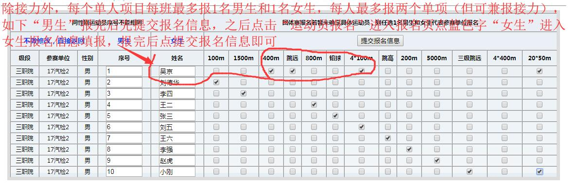 5.除接力外,每个单人项目每班限报男、女各一名,每人最多报2个单项(但可兼报接力项目),如图男生组报名完后先提交,然后再点“运动员报名”后进入报名页面,选点蓝色字体“女生”给女生报名,报完后提交报名信息即可。