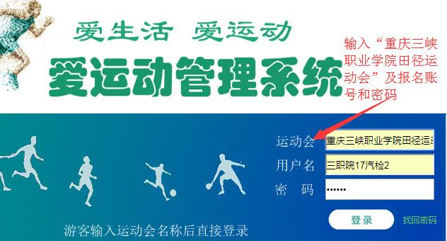2.龙宝校区输入运动会“重庆三峡职业学院田径运动会”、沙龙校区输入运动会“重庆三峡职业学院(沙龙校区)运动会”“报名账号”及密码(如“2023园林技术1”的用户名为“三职院23园技1”,各班具体账户、密码见附件)登录进入;