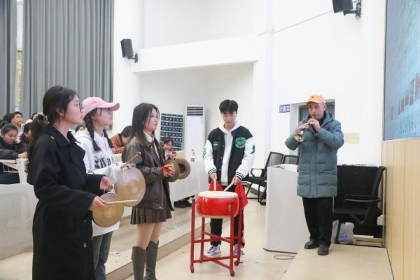 随后的实践环节将现场气氛推向高潮。唐老师热情邀请同学们上台体验鼓、铛锣、包锣、小锣、马锣、钹、镲子等乐器。起初,大家手忙脚乱,但在唐老师的耐心指导下,逐渐掌握了节奏,敲出了整齐有力的节拍。随后,唐老师拿出唢呐加入合奏,一起演奏《秧歌锣鼓——套秧歌舞》。同学们与他默契配合,欢快的《套秧歌舞》旋律在教室中回荡,现场欢声笑语不断,每个人都沉浸在这热烈的非遗氛围之中。