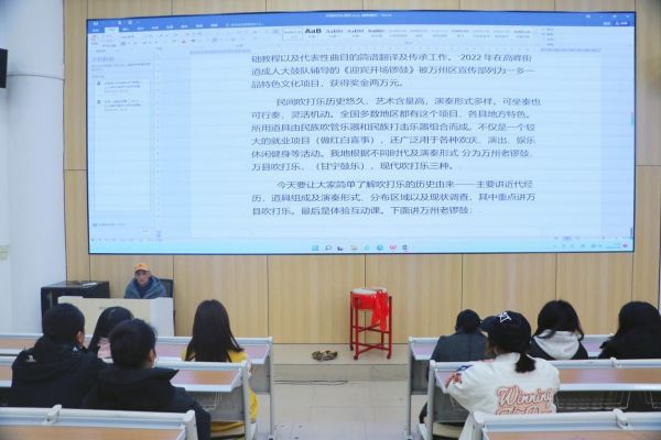 活动伊始,唐老师带领同学们追溯了吹打乐的悠久历史。从远古祭祀、庆典活动中的初现,到历经岁月融合各地民俗,吹打乐逐渐形成了丰富多元的地域流派。在万州,吹打乐更是深深融入了人们的日常生活,尤其是在红白喜事等场合。红事时,明快的旋律传递喜悦;白事上,庄重的曲调寄托哀思。吹打乐不仅是音乐,更是情感的纽带,将人们紧紧相连。通过生动的演奏视频,同学们仿佛置身于吹打乐的世界,感受到这门艺术的独特魅力。唐老师的讲解深入浅出,让大家对吹打乐的历史与文化背景有了更深刻的理解。