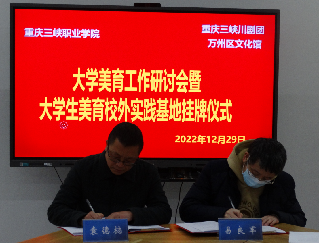 最后,袁德梽副院长代表我校与万州区文化馆和三峡川剧团签订美育教育实践基地协议书,对美育实践基地进行授牌。