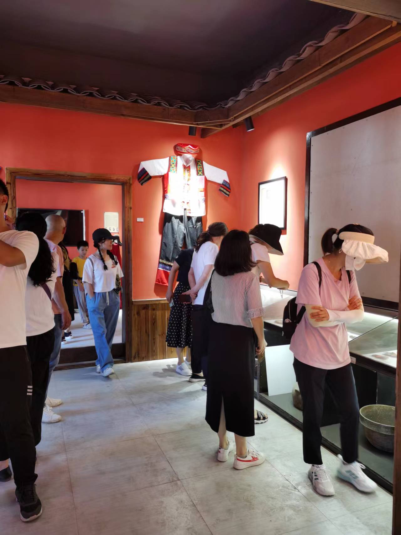 7月12日上午,考察组在五星村便民服务中心生产生活民俗、民间艺术展厅里,通过文字、实物等形式,了解了土家文化之“服饰”、“饮食”及“农耕”方面的知识。考察组认为,作为通识教育的教师,应该在课程中宣传我国多民族文化特色,这是课程思政的要求,也能极大增强少数民族学生的自信心,鼓励更多学生投入到弘扬中华文明的主流大道上。