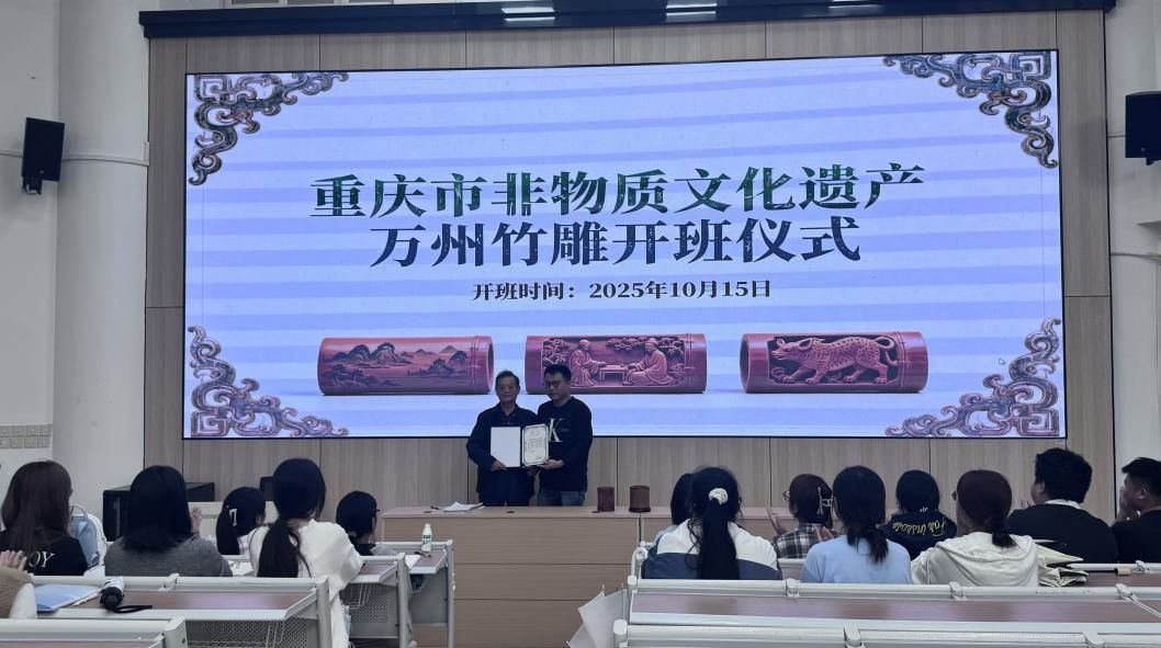 为深化职业教育育人内涵和美育浸润行动,推动中华优秀传统文化与职业素养培育深度融合,2025年10月15日下午14:30,由重庆三峡职业学院联合万州区文化馆、万州区非物质文化遗产保护中心,特邀重庆市级非遗“万州竹雕”传承人王飞老师,在信科楼220教室举行非遗竹雕课程开班仪式,这标志着我校在非遗技艺活化传承与职业教育融合领域迈出关键一步。