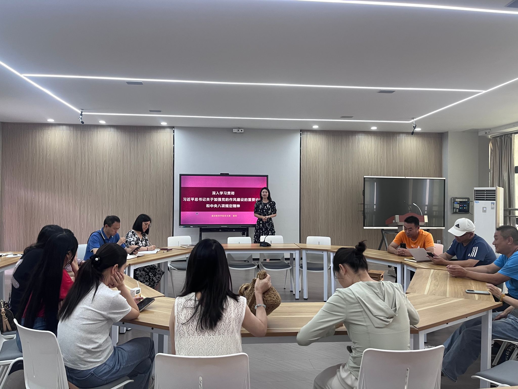 2025年6月10日,通识教育学院党支部开展深入贯彻中央八项规定精神专题党课。党支部书记、副院长潘雪以《深入学习贯彻习近平总书记关于加强党的作风建设的重要论述和中央八项规定精神》为题,为全体党员讲授了一堂内容丰富、意义深刻的党课。党课通过历史与现实的双重视角,深入阐释了中央八项规定精神的核心要义和时代价值。