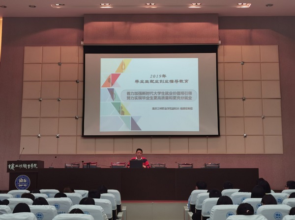 近年来,大学生就业问题已然成为社会关注的焦点,面对当前严峻的就业形势,为了做好我院2020届毕业生就业指导工作,教育、引导毕业生了解就业政策、正确认识就业形势,帮助毕业生进行科学合理的职业生涯规划设计,树立正确的就业价值观,掌握正确的择业方向。2019年10月14日下午,经济管理学院党总支特邀请学校党委委员、副校长杨建宏教授在学术报告厅为经济管理学院2017级同学开展了《着力加强新时代大学生就业价值观引领,努力实现毕业生更高质量和更充分就业》就业指导专题讲座,讲座由就业指导中心赵婵娟科长主持。