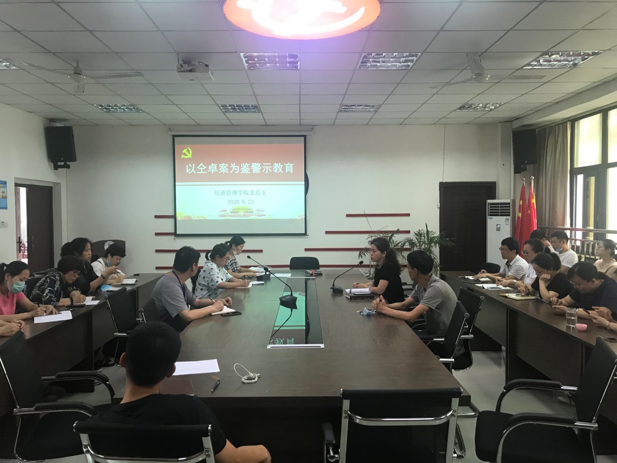 为持续加强党风廉政建设,进一步增强教师廉洁从教意识,树立严格自律、爱岗敬业的高校教师形象。6月23日下午,经济管理学院在奥训楼506会议室开展“以仝卓案为鉴”警示教育。会议由经济管理学院党总支书记、院长赵琳主持,经济管理学院全体教职工参加了此次活动。
