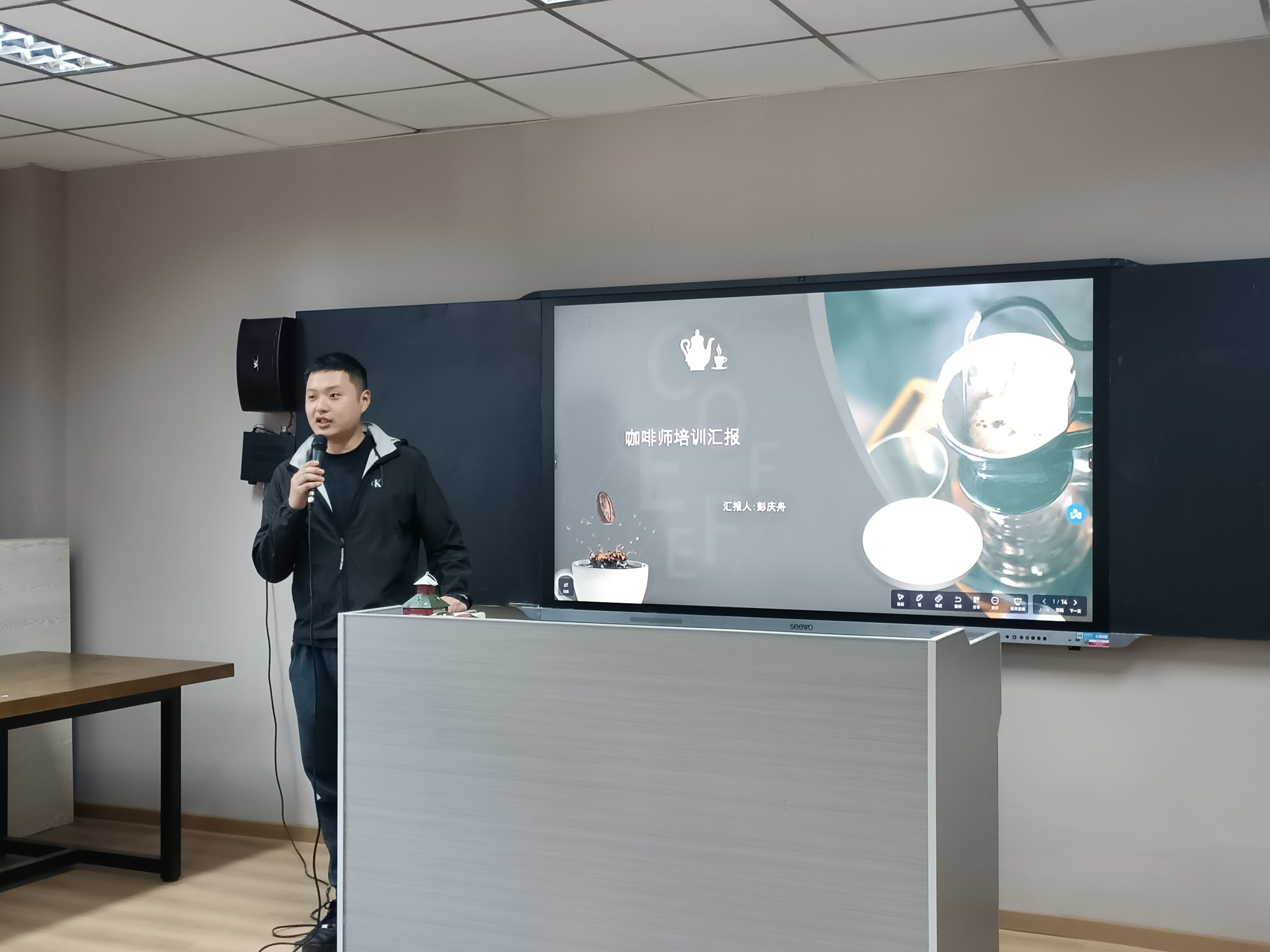 参与暑期培训项目的各教师代表通过PPT汇报的方式介绍了培训情况和心得体会,参与育婴员培训项目的黄茜、莫英莺老师现场展示了育婴员实操技能,参与调饮师、咖啡师培训项目的马茜、潘琪、彭庆舟老师,现场冲调了新式调饮、咖啡,与会教师纷纷进行了品尝。参培教师纷纷表示这次暑期培训收获良多,并感谢学校和学院领导对教师培训工作的重视和支持。针对每位教师汇报的内容,全体教师热烈讨论,并相互交流教学过程中遇到的新问题,获取新理念、新教法、新技术,充分调动了教师们的学习热情,营造了良好的教学氛围。