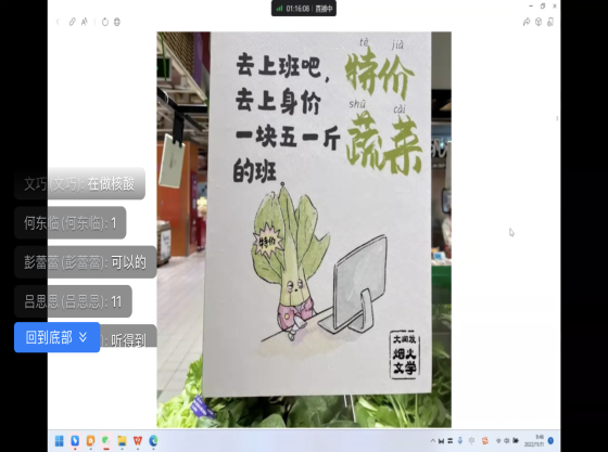“请ID是‘美好人生’的同学回答一下这个问题。”“限时签到转瞬即逝,稍不留神恐怕就要错过”22级市场营销1班的张龙梁同学坦言,线上授课的老师的会随机连麦抽查比点名签到更刺激。“我们都不敢被窝听课,不仅辅导员会经常突击检查,任课老师上课要求我们开视频了”。22级时候营销1班田甜说道。